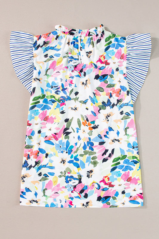 Light Blue Floral Print Striped Ruffled Sleeve Blouse