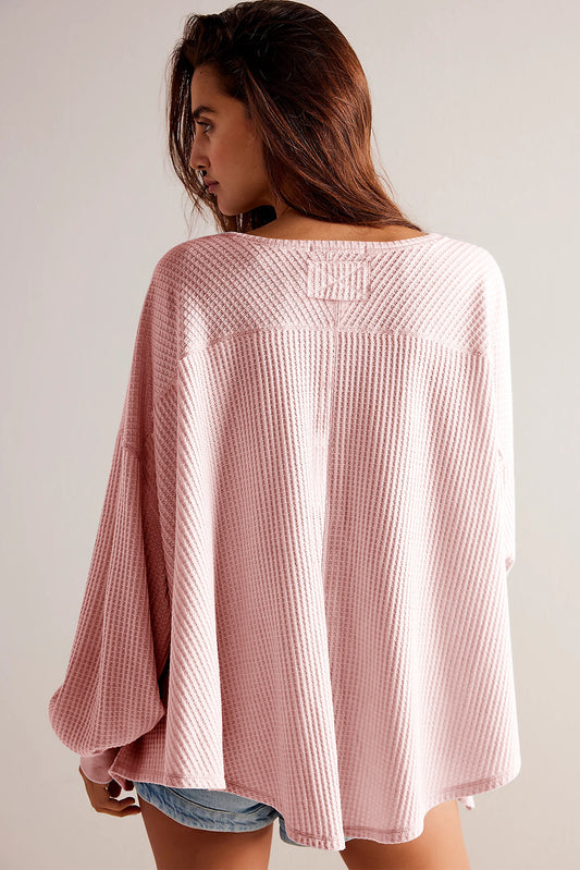 Light Pink Waffle V Neck Long Sleeve Drop Shoulder Loose Blouse