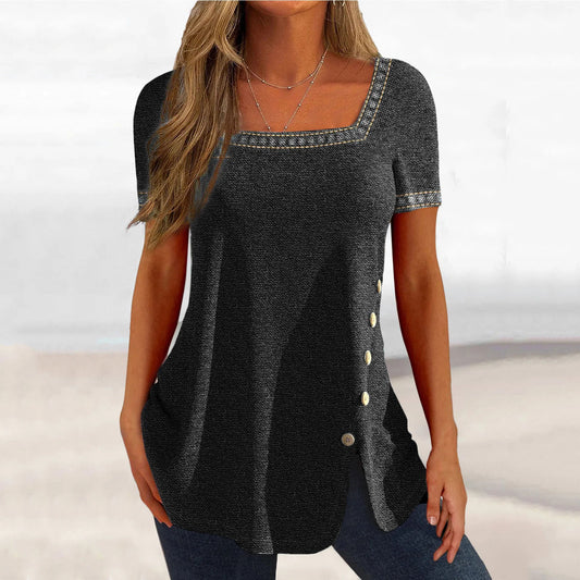 Printed Button Slit Short-sleeved Top T-shirt Women's Clothing