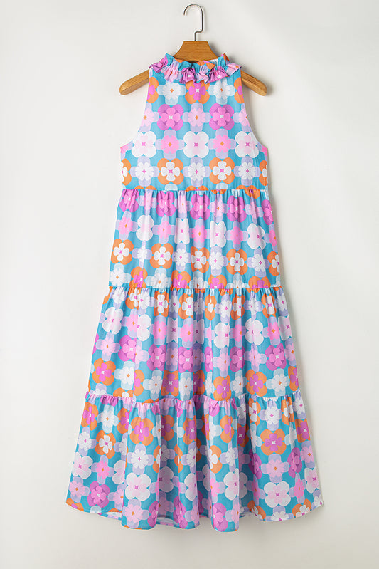 Sky Blue Floral Print Frilly Neck Sleeveless Tiered Maxi Dress