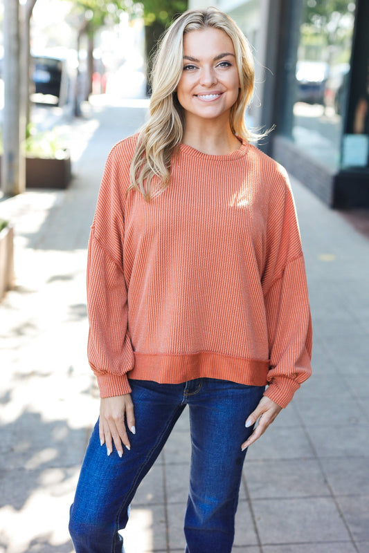 Weekend Ready Rust Mineral Wash Rib Pullover Top