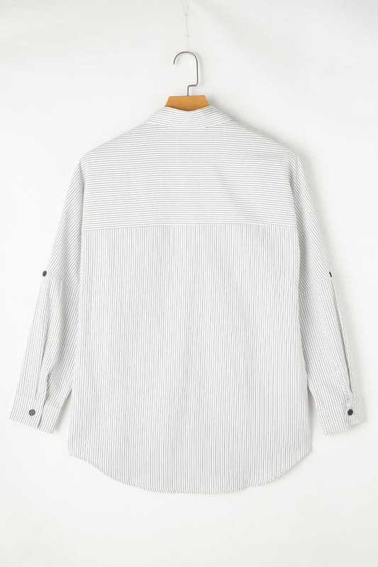 Black Stripe Roll-tab Sleeve Pocketed Long Shirt
