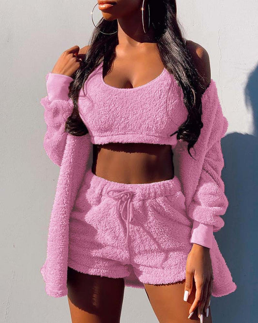 Autumn And Winter New Knitted Plush Long Sleeve Coat Vest Shorts Four-piece Set