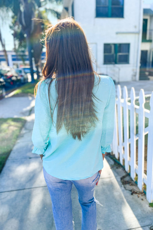 Elegant You Mint Frill Neck Back Button Ruffle Sleeve Blouse
