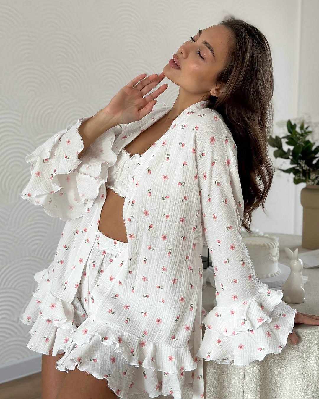 100 Cotton Printed Long-sleeve Nightgown And Shorts Pajama Set