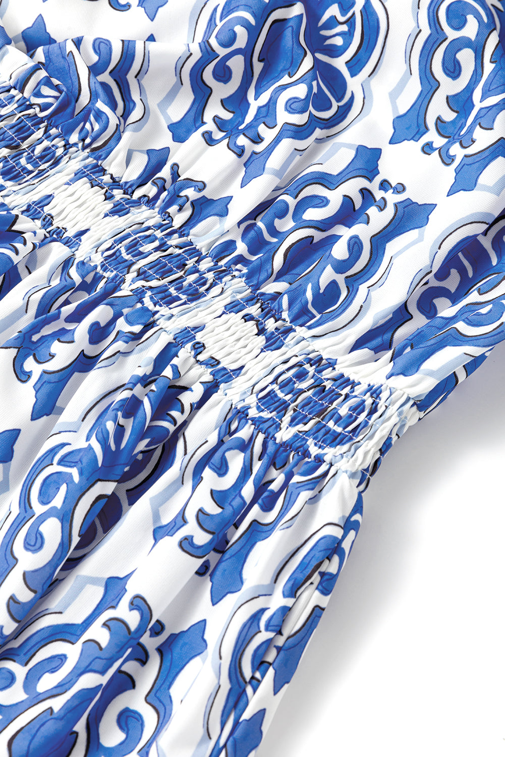 It features a standup collar with ruffle details and lace up, smocked waist and ruffled hem