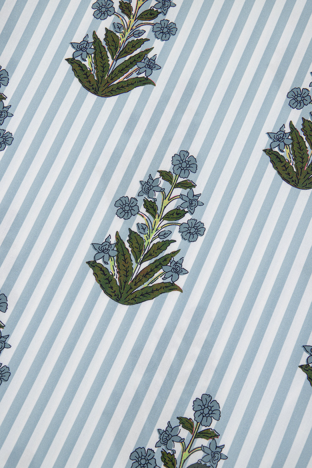 Beau Blue Striped Floral Printed Long Sleeve Tied V Neck Blouse
