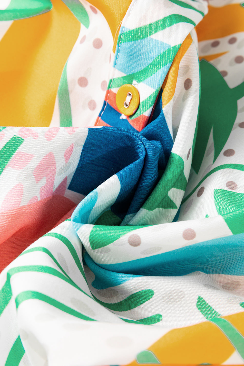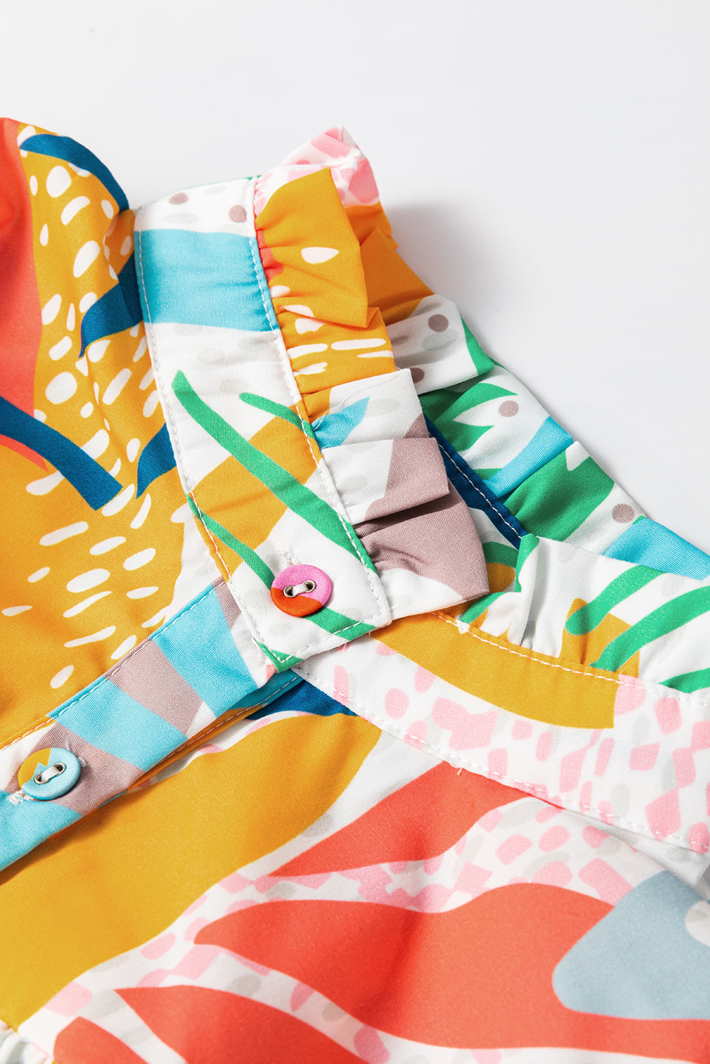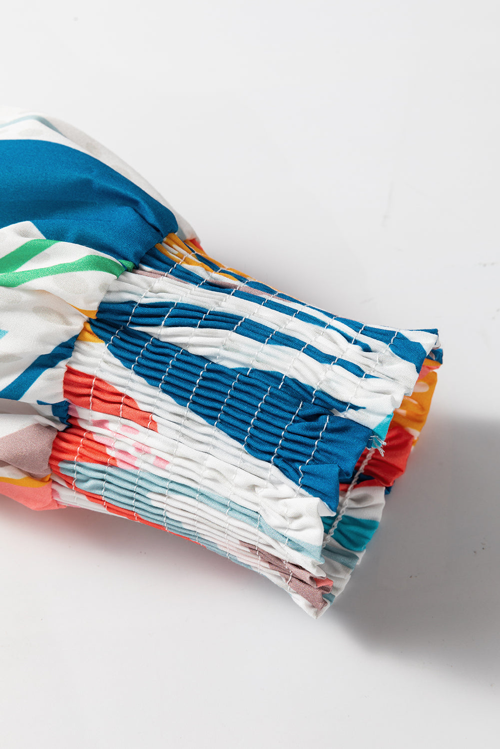 Beige Abstract Smocked Ruffled Lantern Sleeve High Neck Shirt