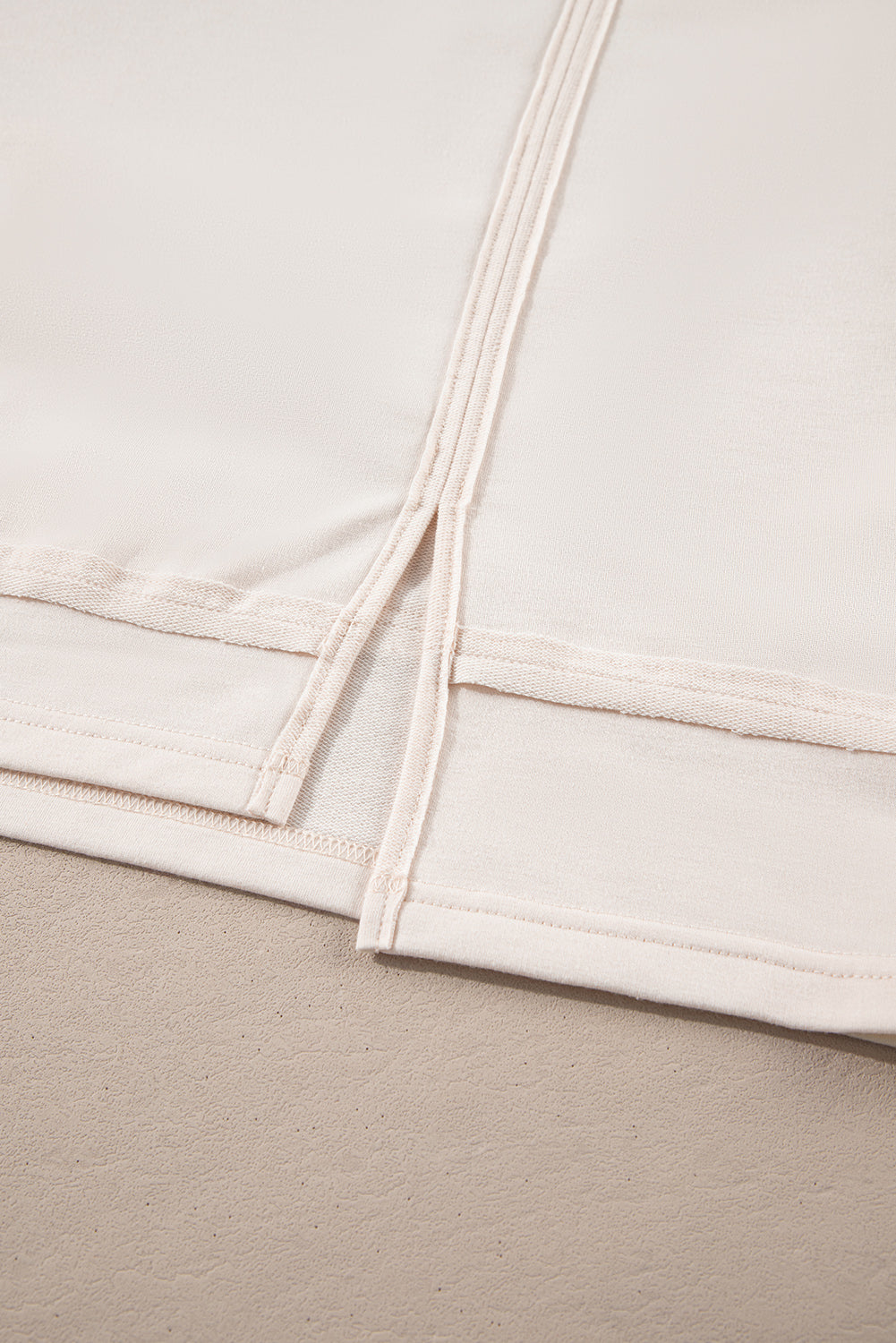 This beige colored top features delicate pearl detailing on the sleeves and neckline.