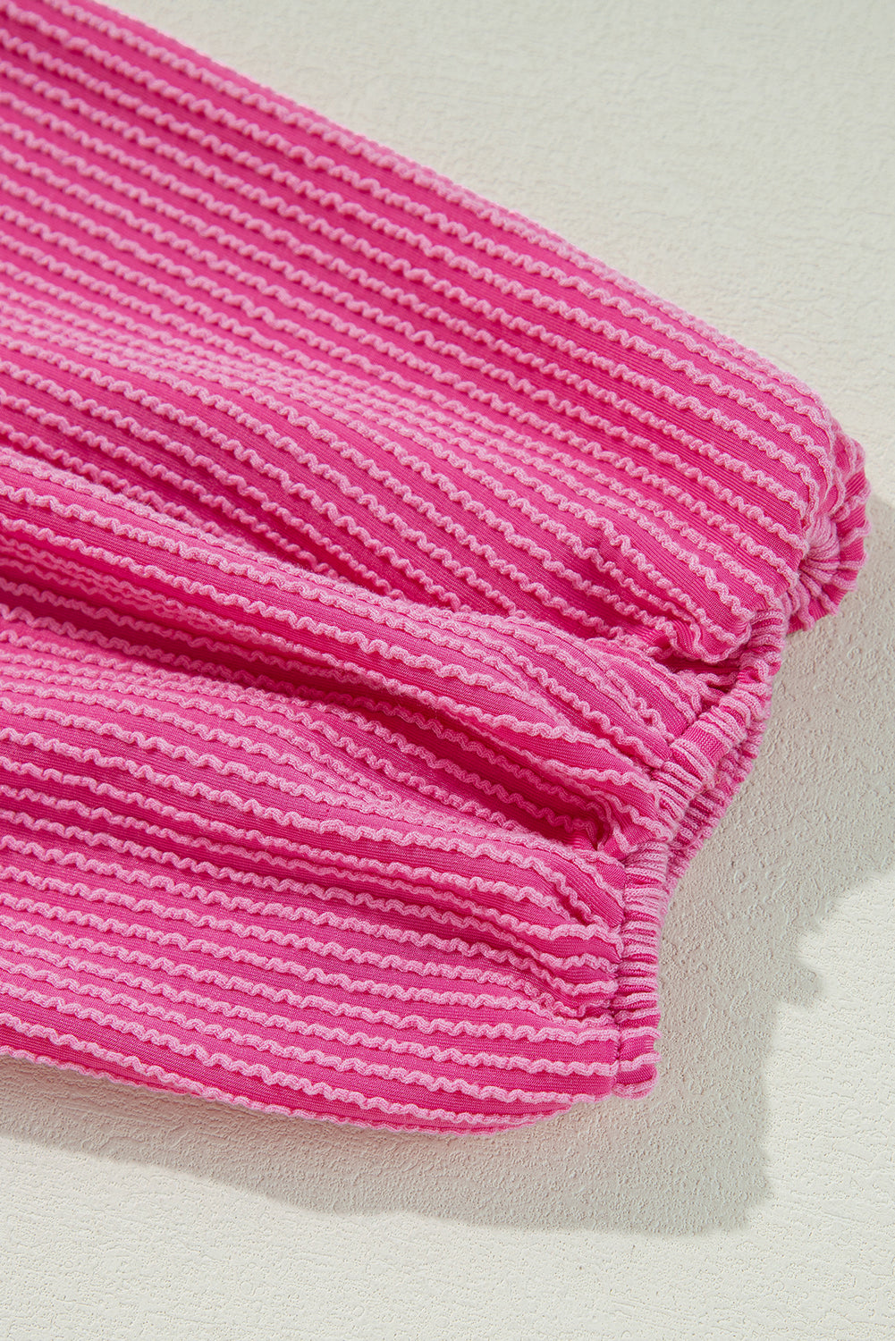 Bright Pink Corded Turn-down V Neck Bubble Sleeve Babydoll Blouse