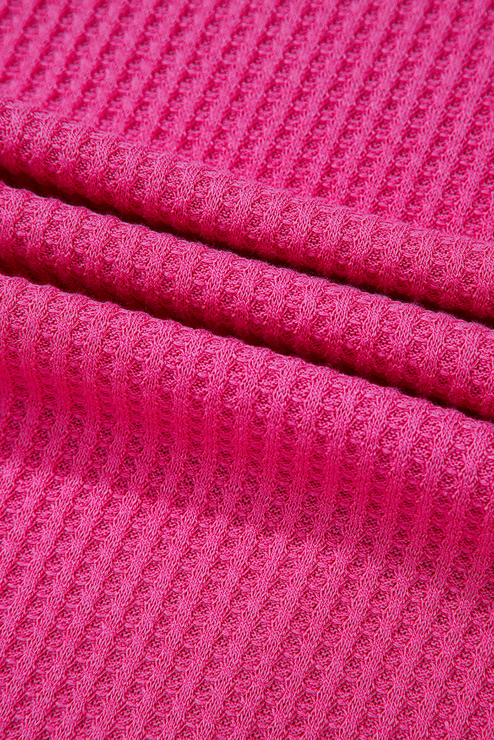 Bright Pink Waffle V Neck Long Sleeve Drop Shoulder Loose Blouse