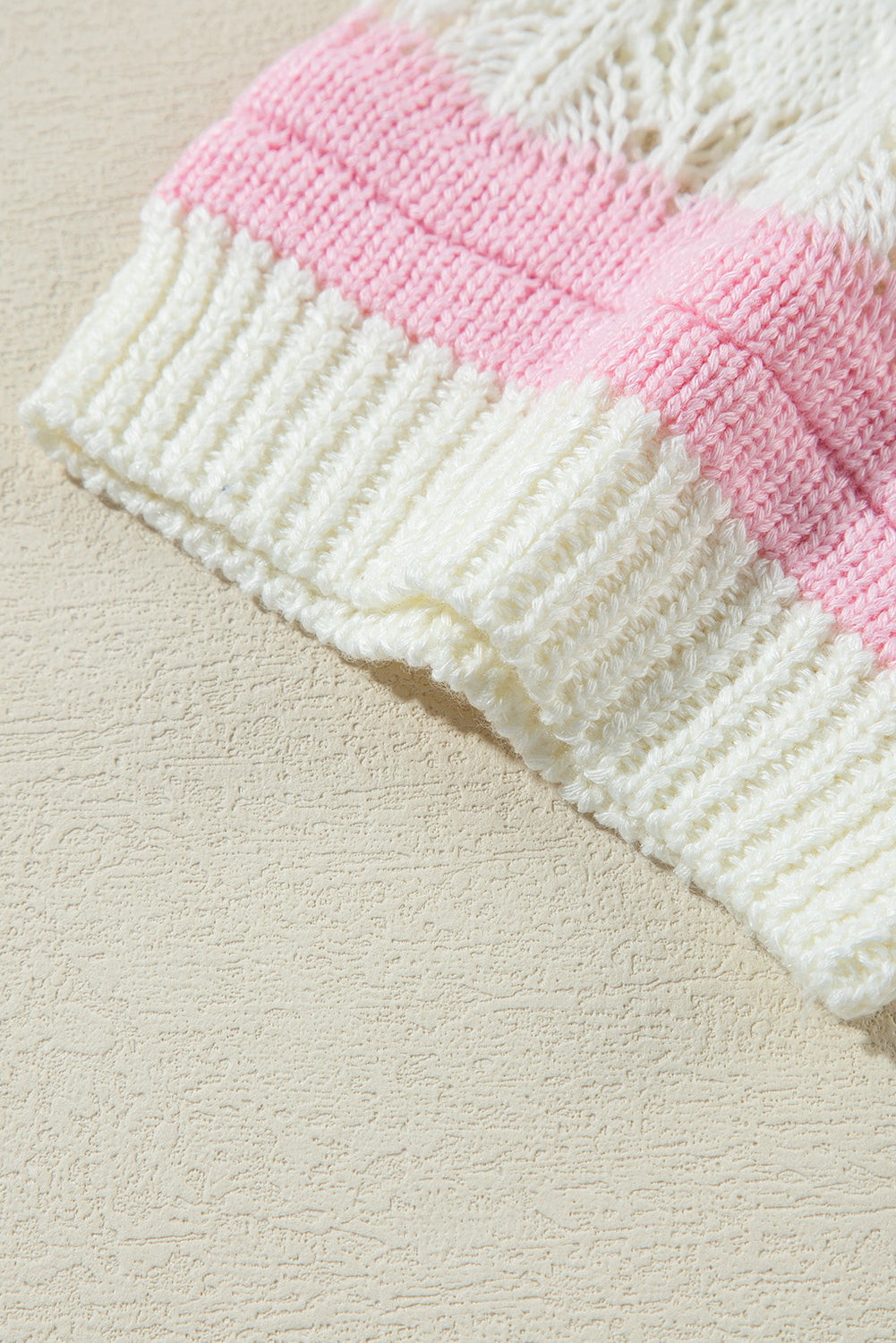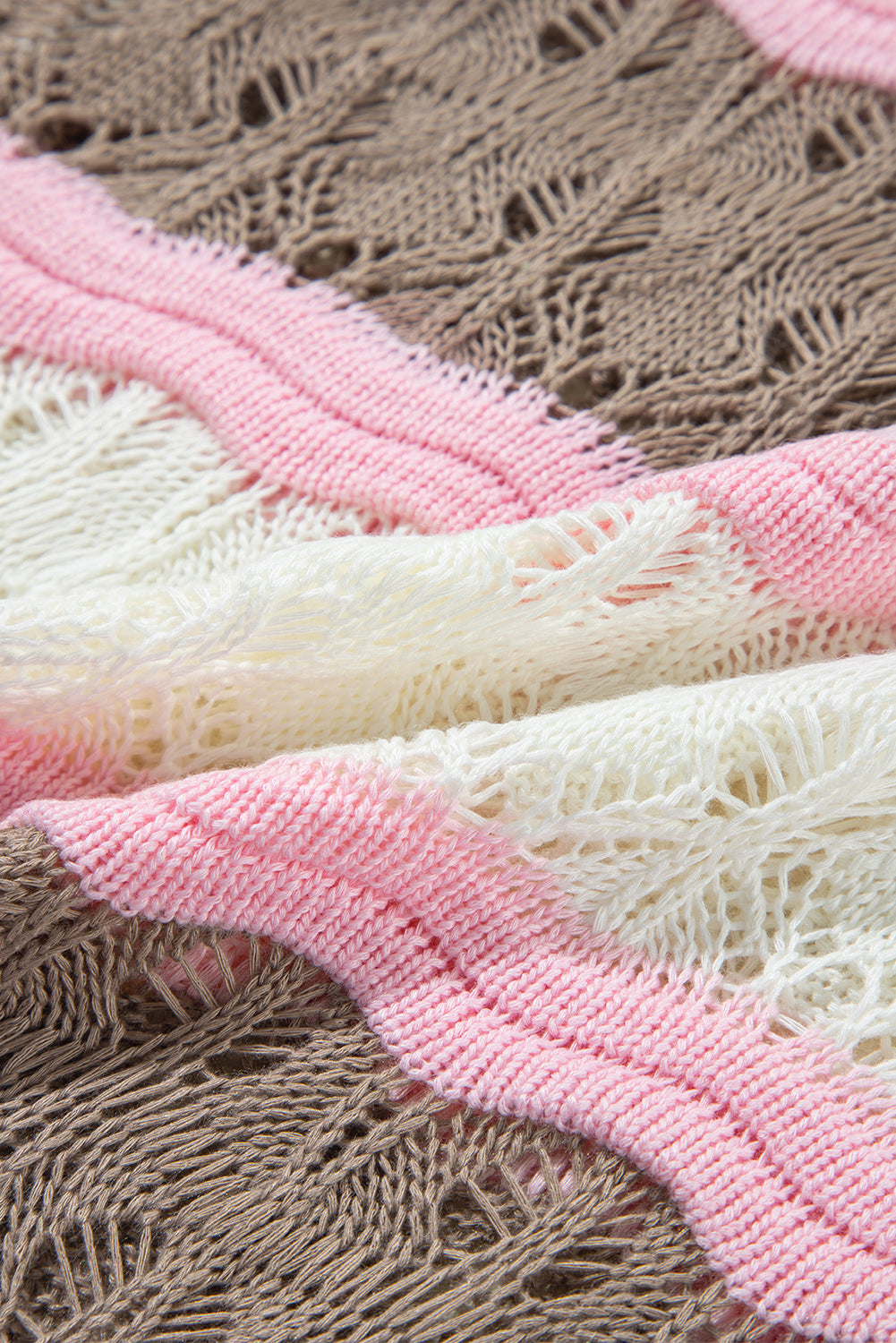 Brown Stripe Color Block Hollow Out Crochet Half Sleeve Sweater