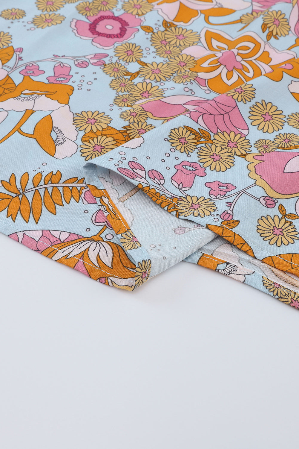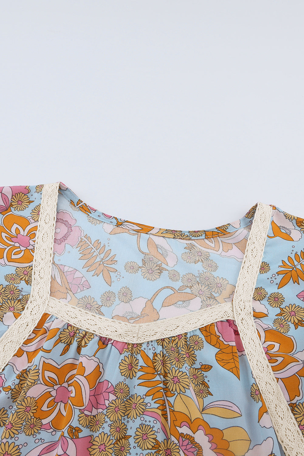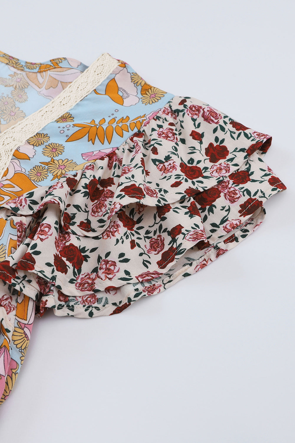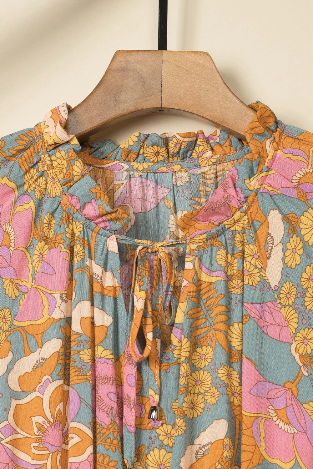 Brown Vintage Floral Smocked Bodice Flare Sleeve Tiered Long Dress