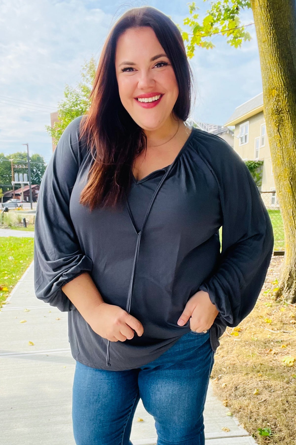 Versatile Charcoal Front Tie Modal Knit Peasant Top