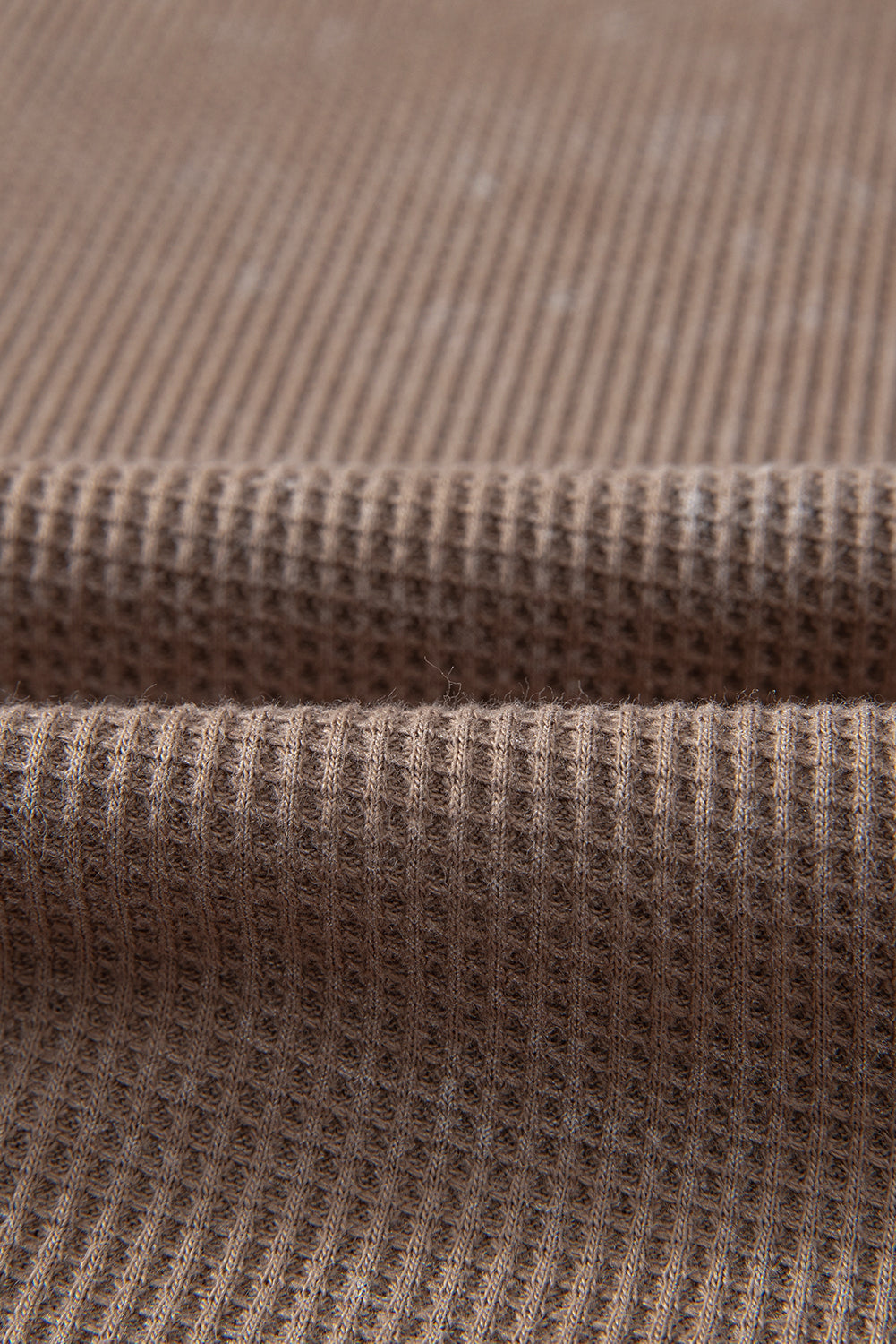 Coffee Acid Wash Waffle Knit Buttoned Neckline Long Sleeve Top