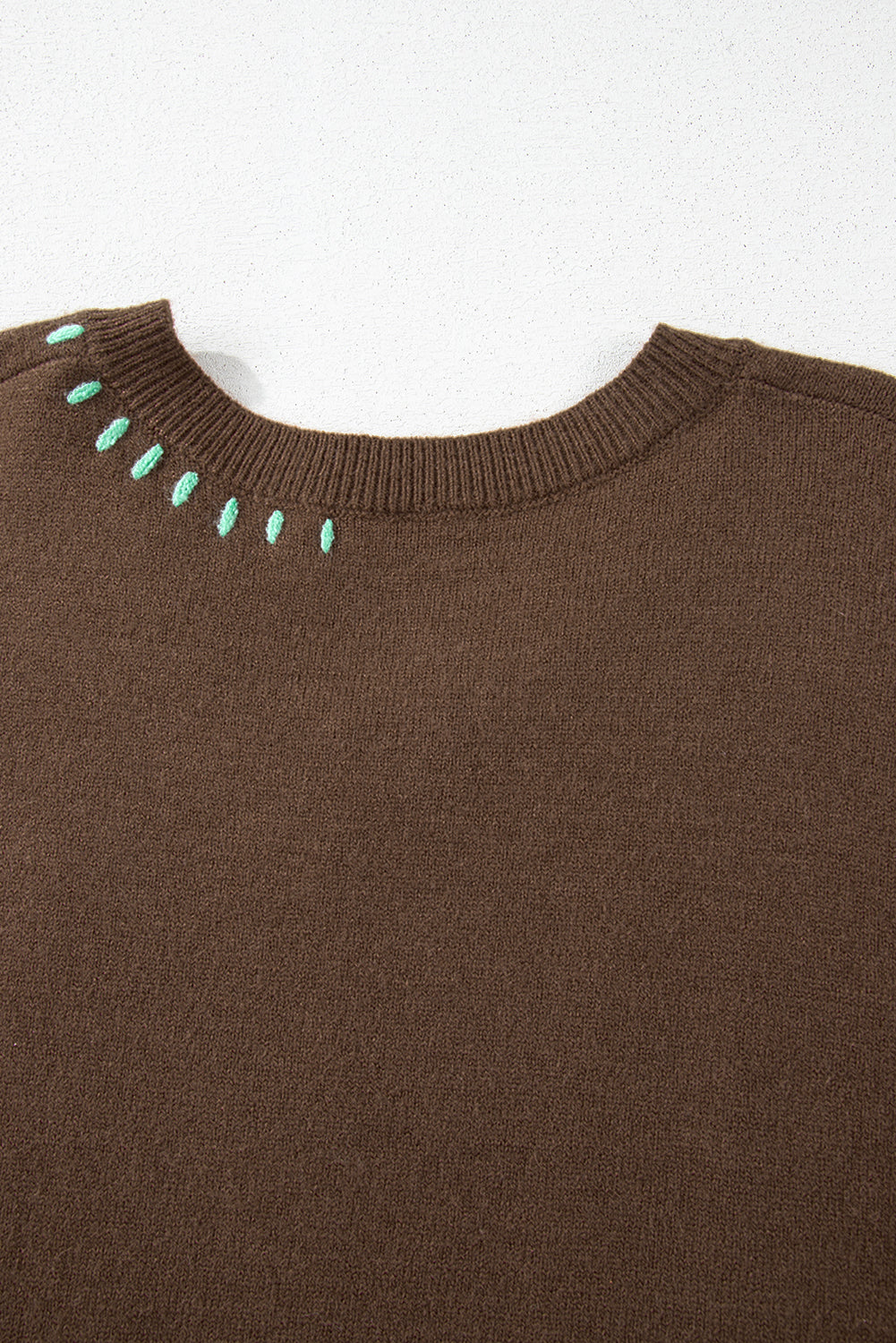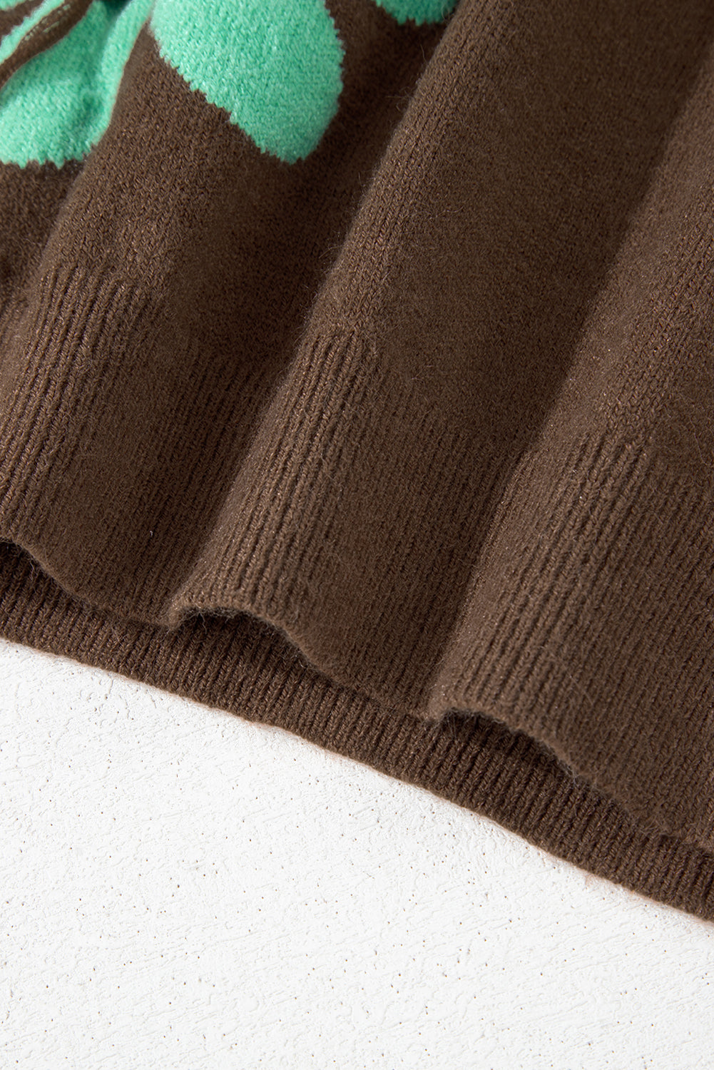 Coffee Big Flower Pattern V Neck Drop Shoulder Sweater