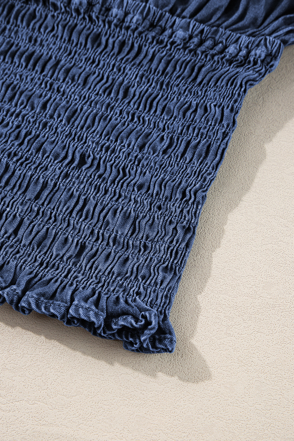 Dark Blue Smocked Ruffled Puff Sleeve V Neck Denim Blouse