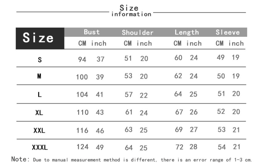 1. Asian sizes are 1 to 2 sizes smaller than European and American people. Choose the larger size if your size between two sizes. Please allow 2-3cm differences due to manual measurement. 2. Please check the size chart carefully before you buy the item, if you don't know how to choose size, please contact our customer service. 3.As you know, the different computers display colors differently, the color of the actual item may vary slightly from the following images.