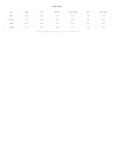 Details: Size Chart:(Product Measurement) Small:Bicep Length:16.7IN,Bust:43.3IN,Cuff:7.5IN,Length:25.6IN,Shoulder:21.3IN,Sleeve Length:21.5IN Medium:Bicep Length:17.3IN,Bust:44.9IN,Cuff:7.9IN,Length:26.0IN,Shoulder:22.0IN,Sleeve Length:21.7IN Large:Bicep Length:18.1IN,Bust:47.2IN,Cuff:8.5IN,Length:26.6IN,Shoulder:23.2IN,Sleeve Length:21.9IN X-Large:Bicep Length:18.9IN,Bust:49.6IN,Cuff:9.1IN,Length:27.2IN,Shoulder:24.4IN,Sleeve Length:22.2IN This data was obtained from manually measuring the product, it may be off by 1-2 IN