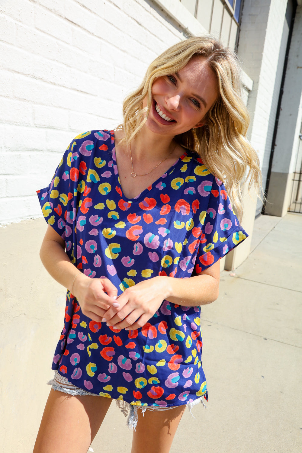 Follow Me Navy Blue Animal Print V Neck Dolman Hi-Lo Blouse