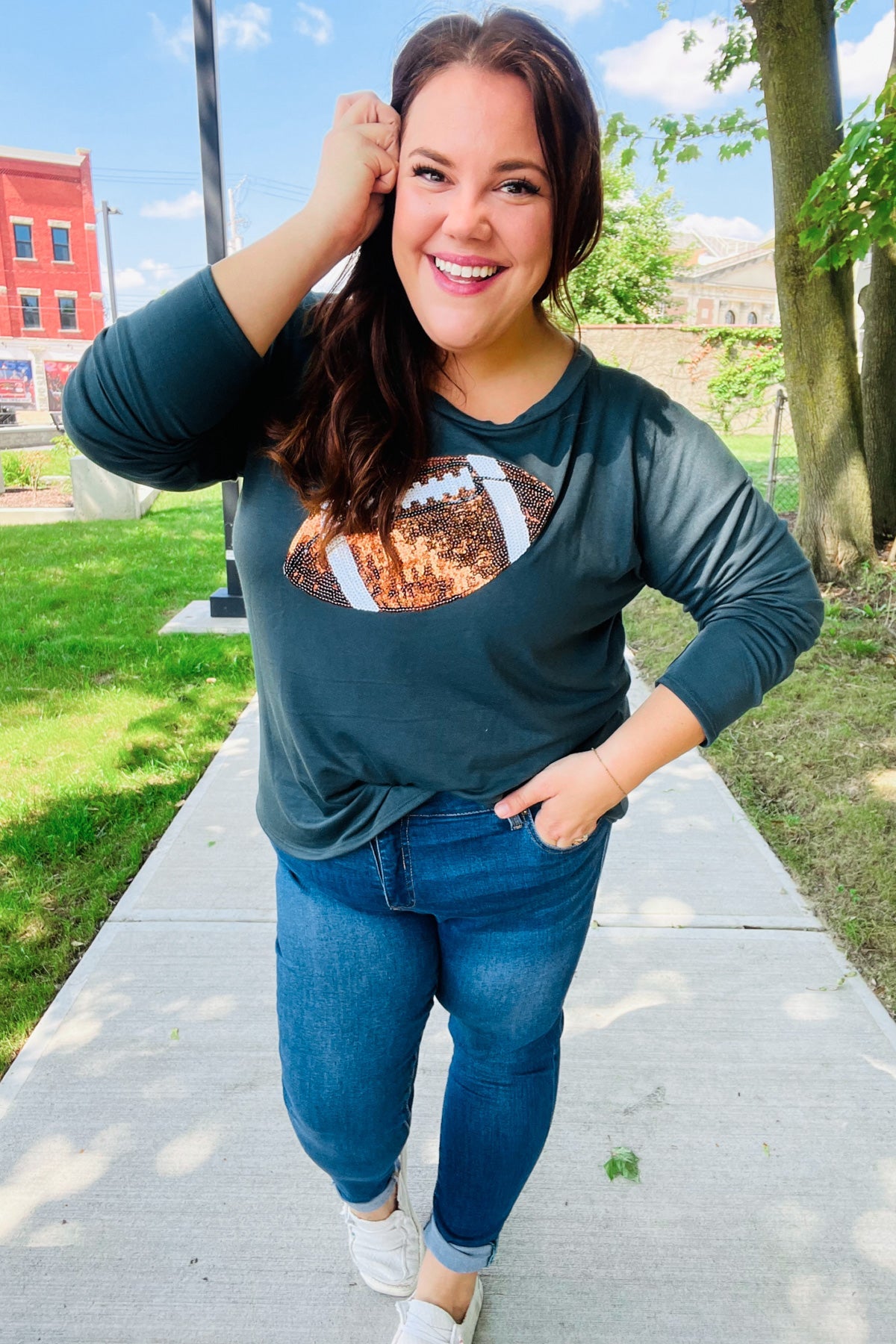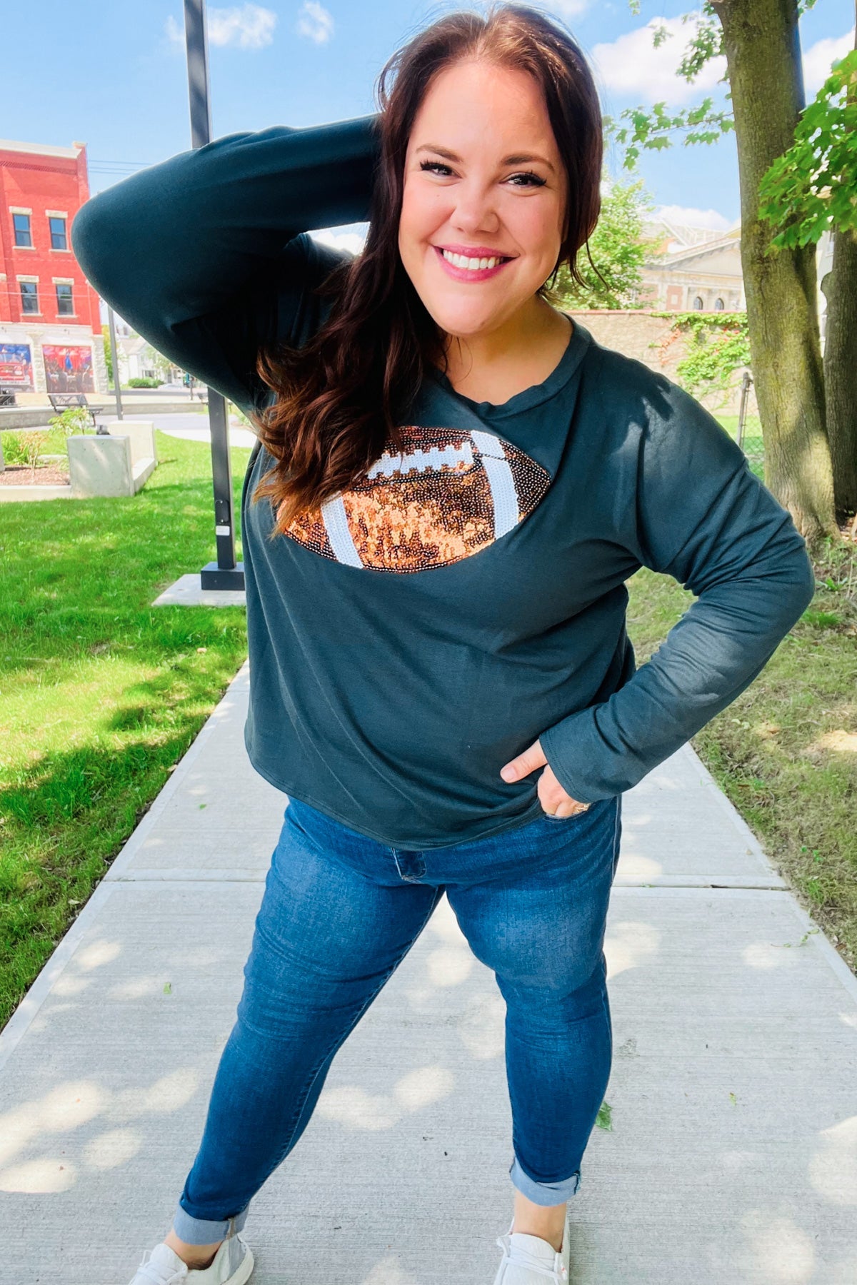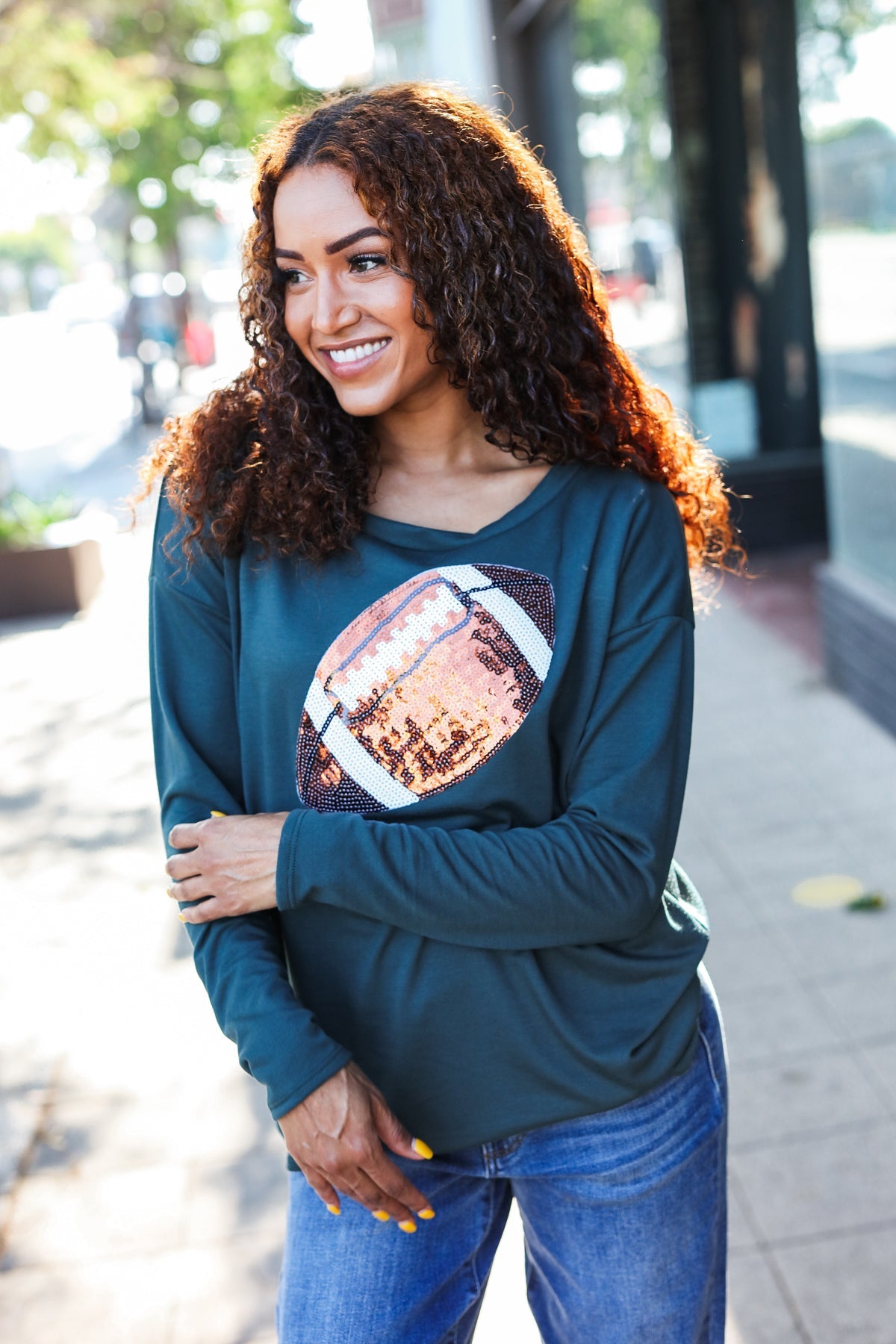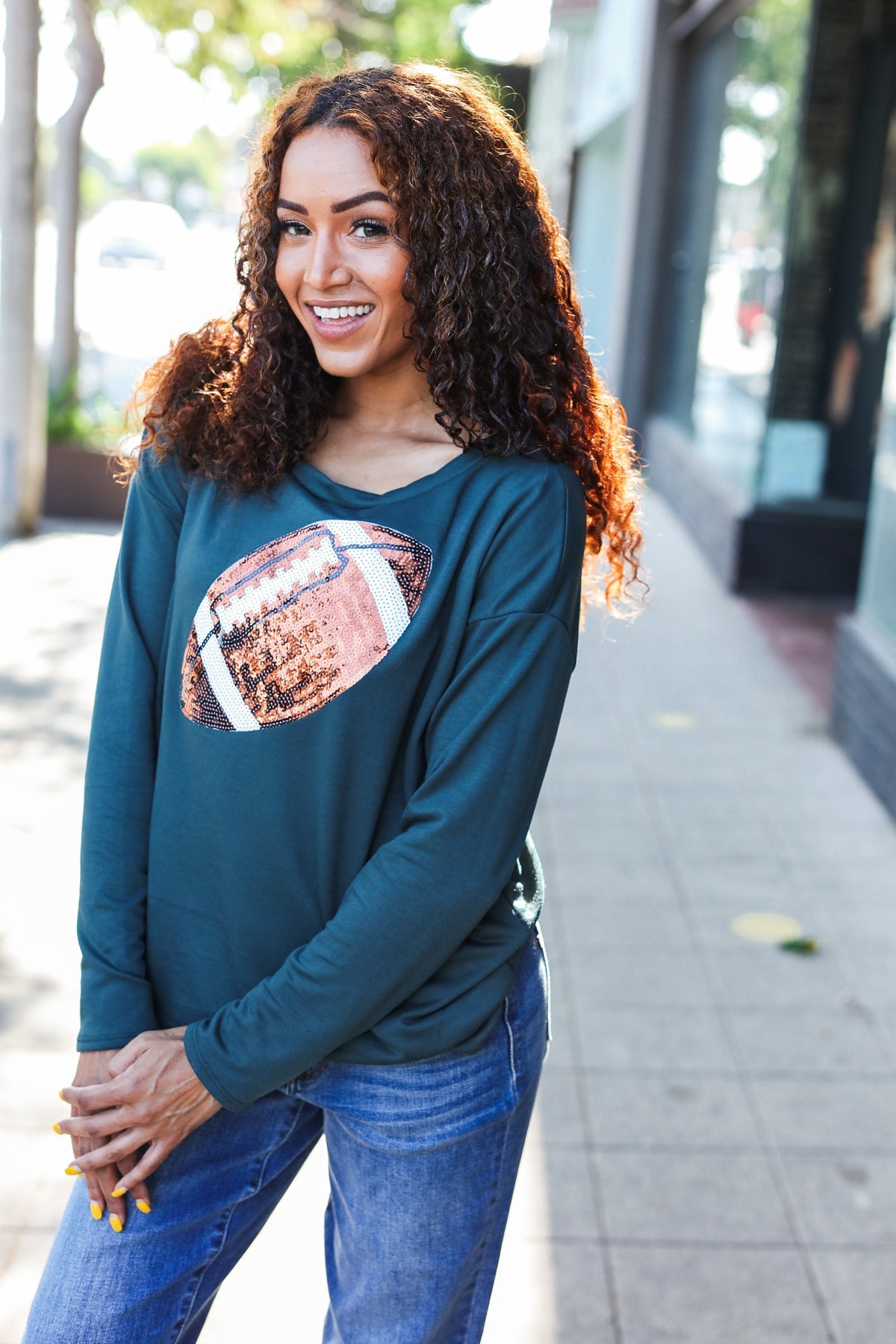 Get ready for game day with this sequin football patch top featuring soft French terry, drop shoulders and a cozy fit.