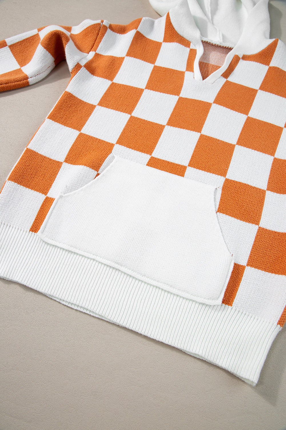 Gold Flame Checkered Split Neck Contrast Kangaroo Pocket Hooded Sweater