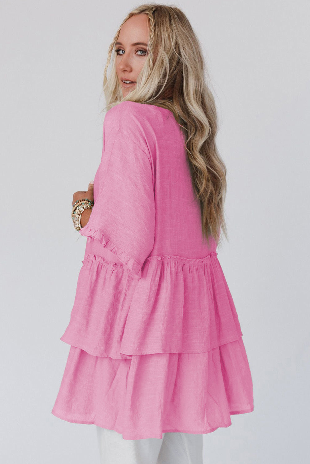 Gray Ruffled Trim Half Sleeve Open Front Kimono