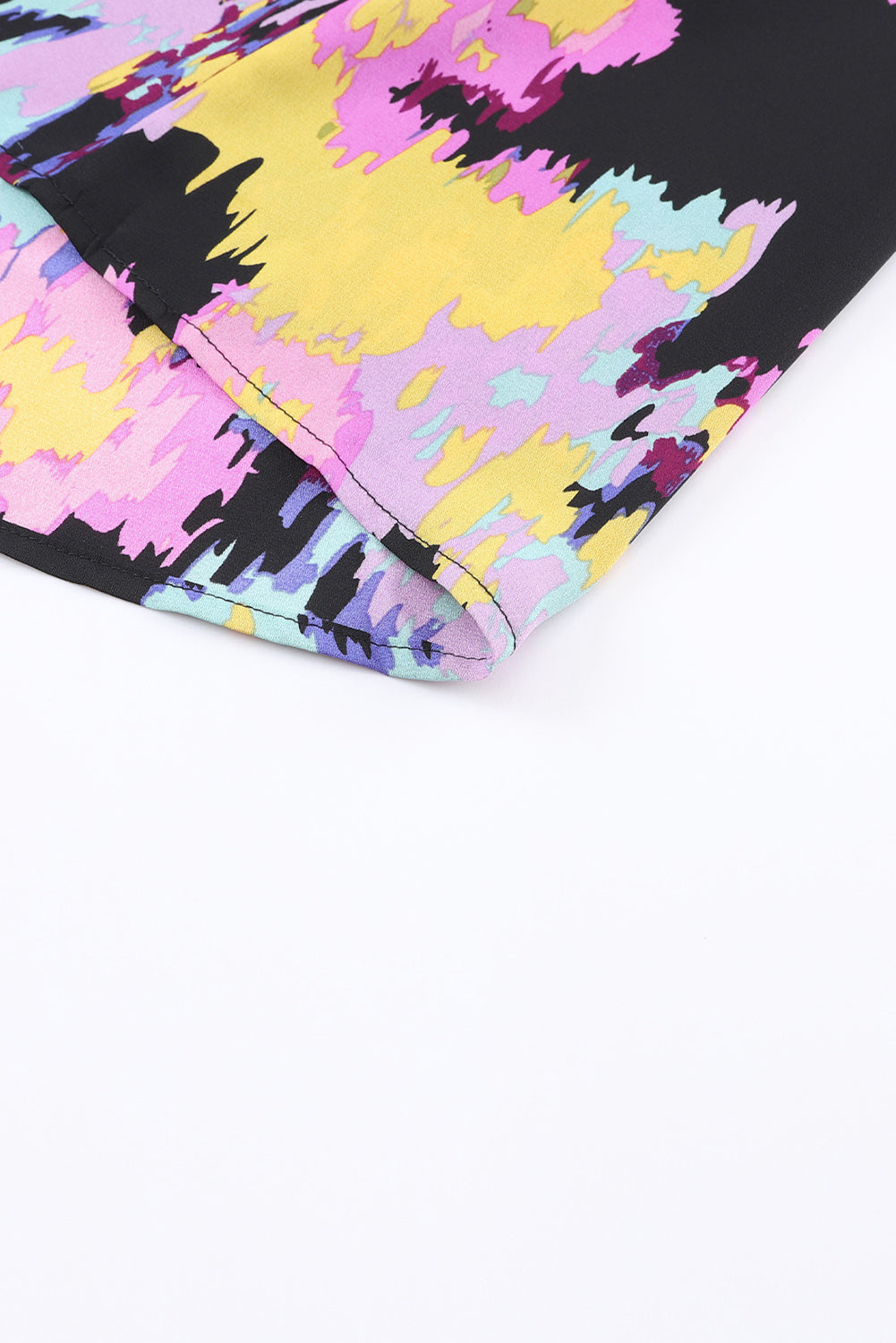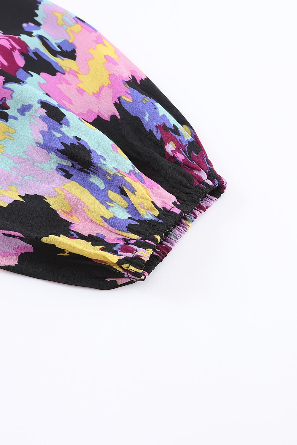 Green Abstract Print Frilled Neck Gigot Sleeve Dress with Waist Tie