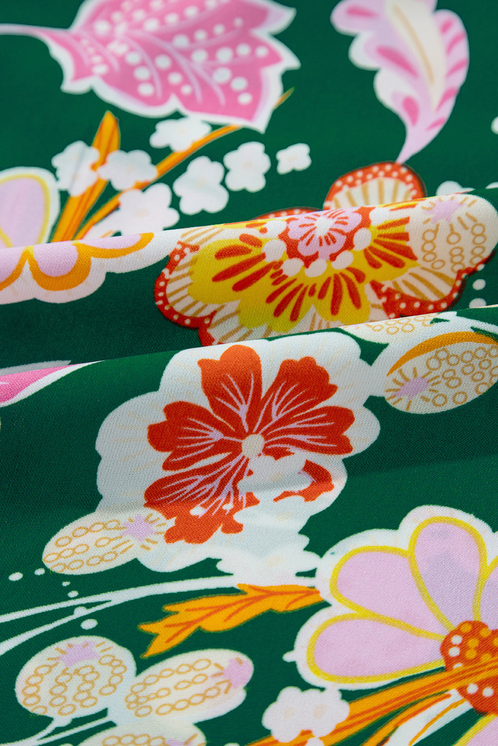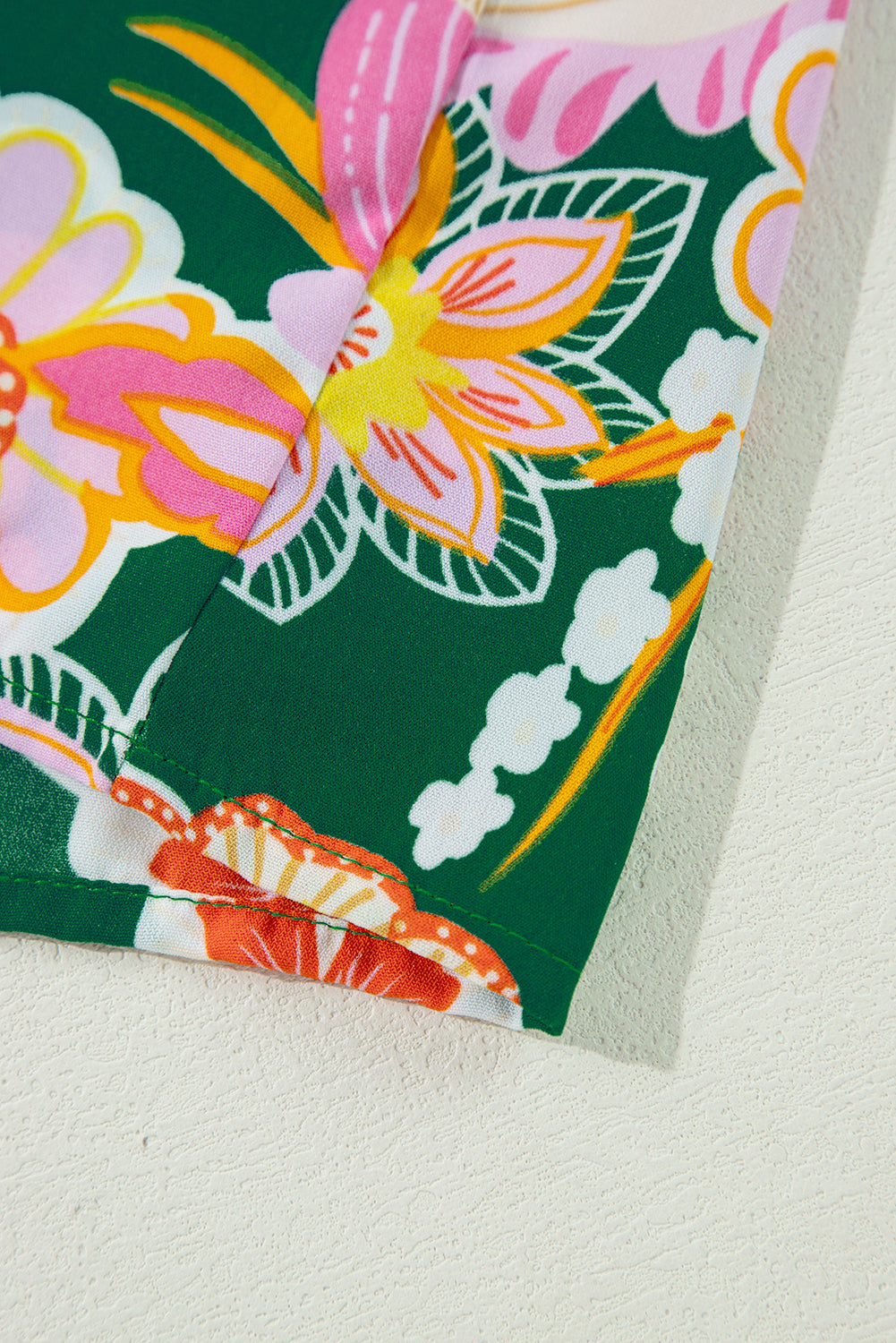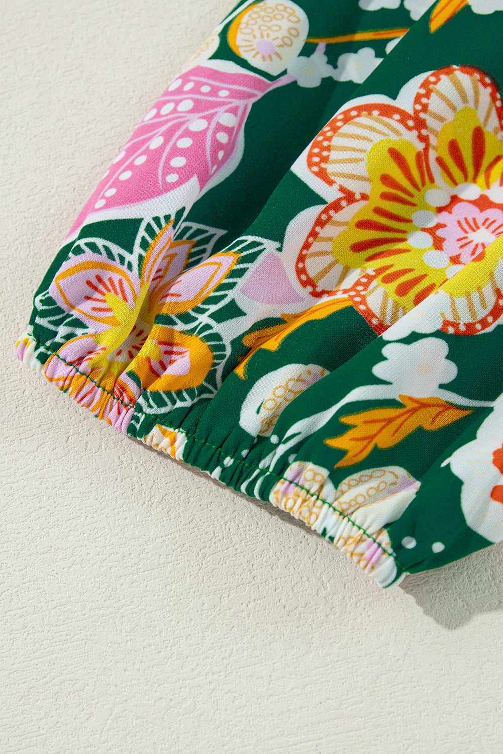 Green Floral Tied V Neck Long Sleeve Plus Size Babydoll Top