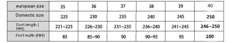 Size: 36/37 (suitable for 35-36),38/39 (suitable for 37-38),40/41 (suitable for 39-40),42/43 (suitable for 41-42),44/45 (suitable for 43-44)