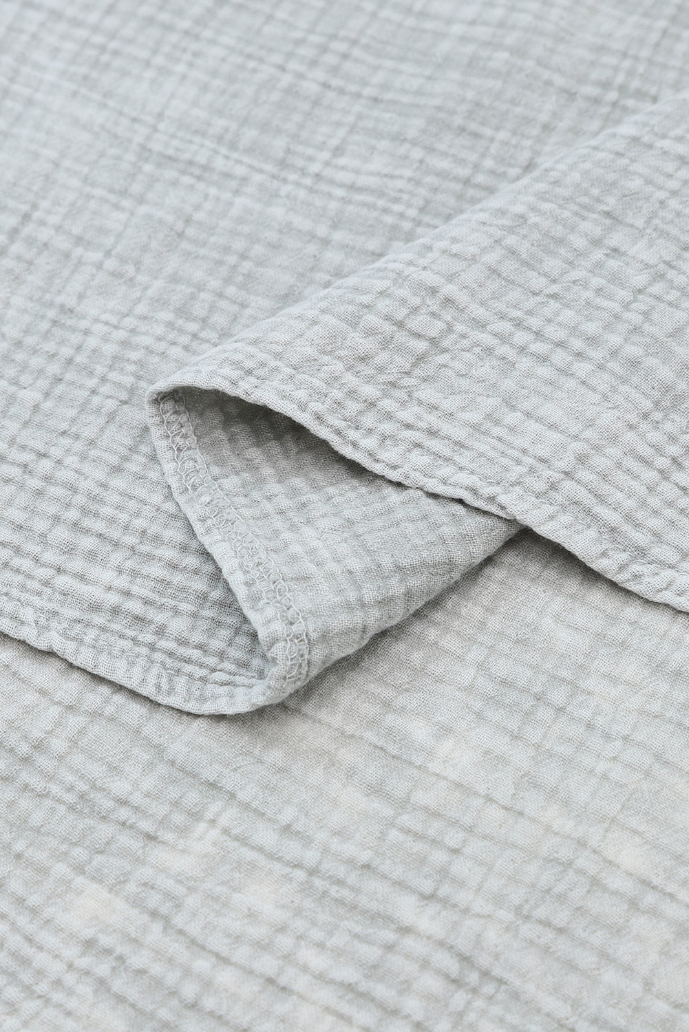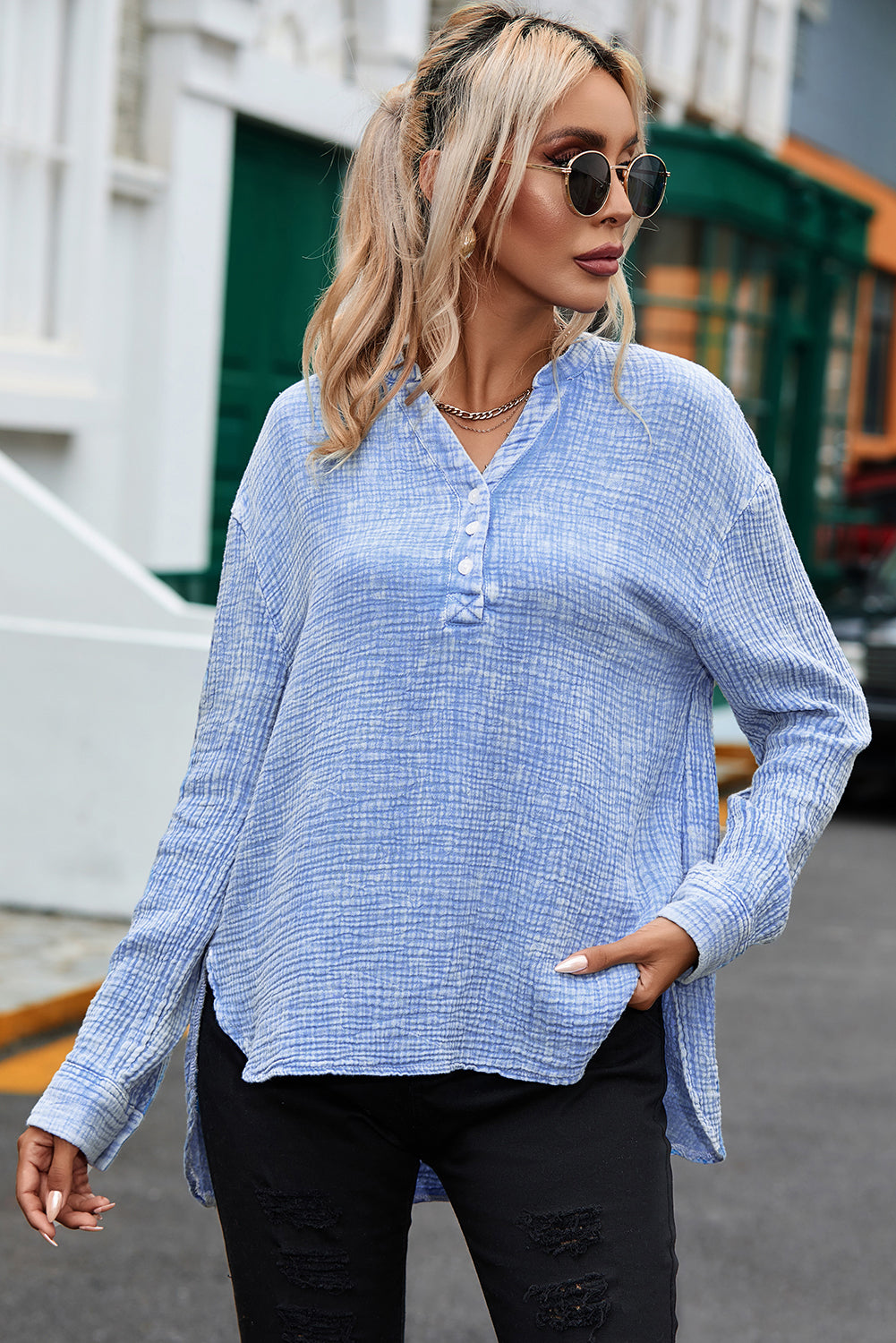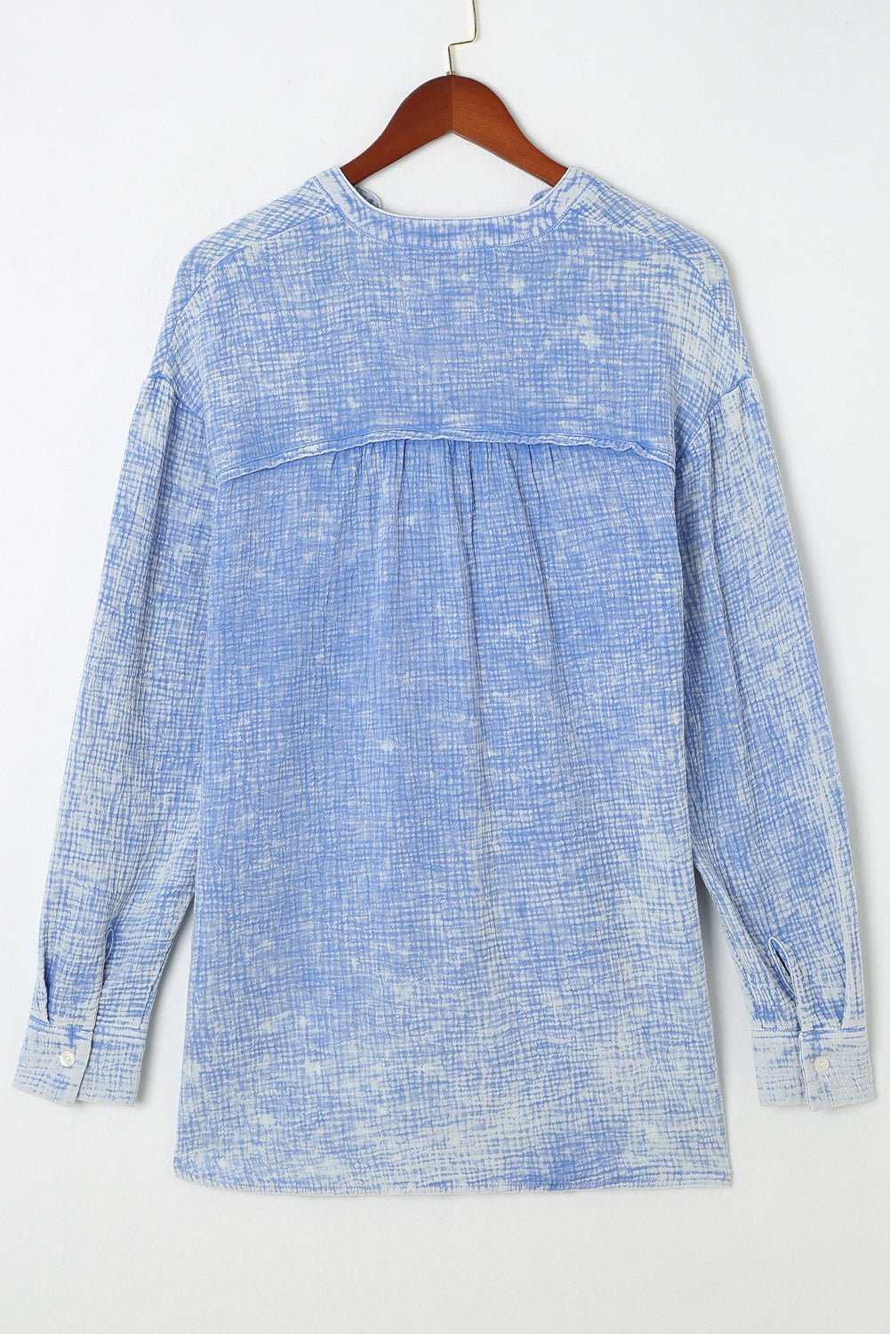 Light Blue Plus Size Split Neck Buttons Crinkled Blouse