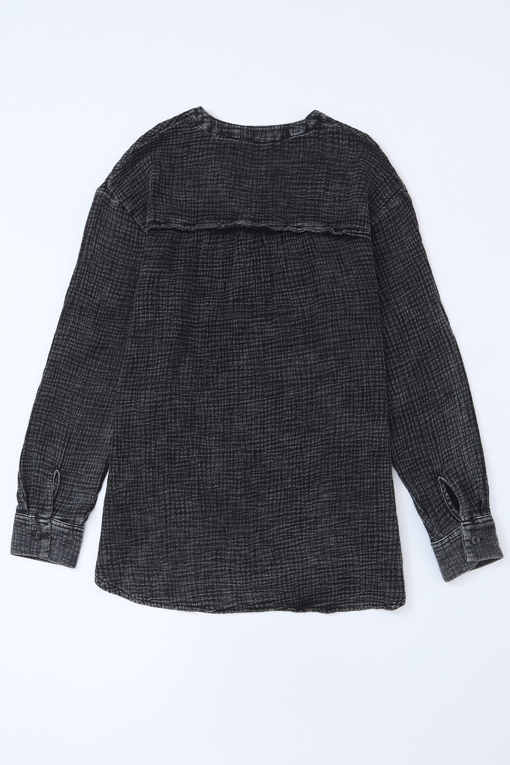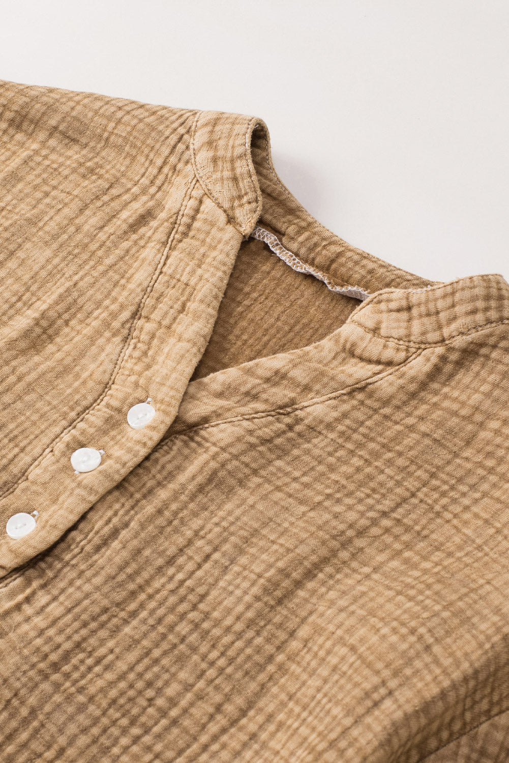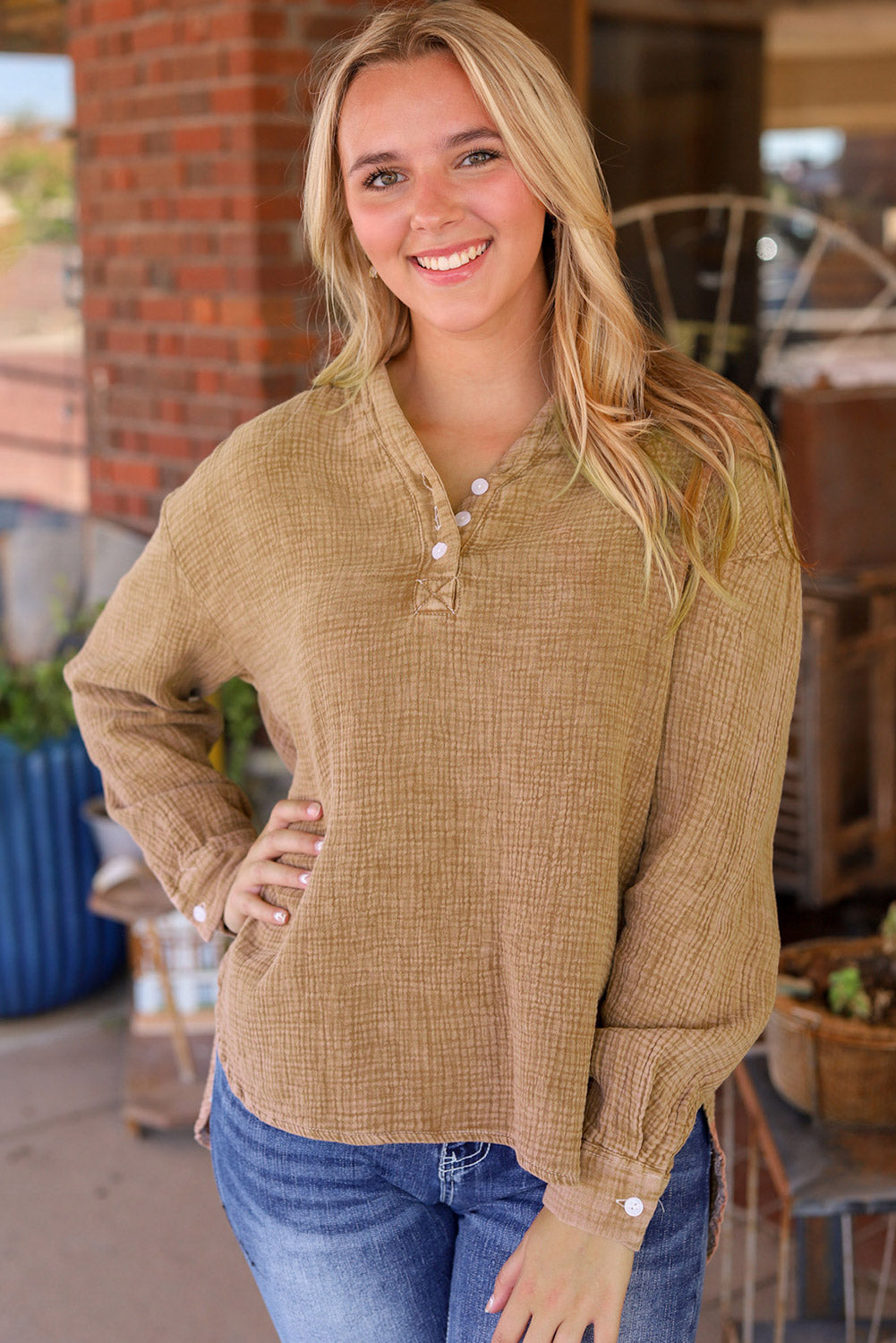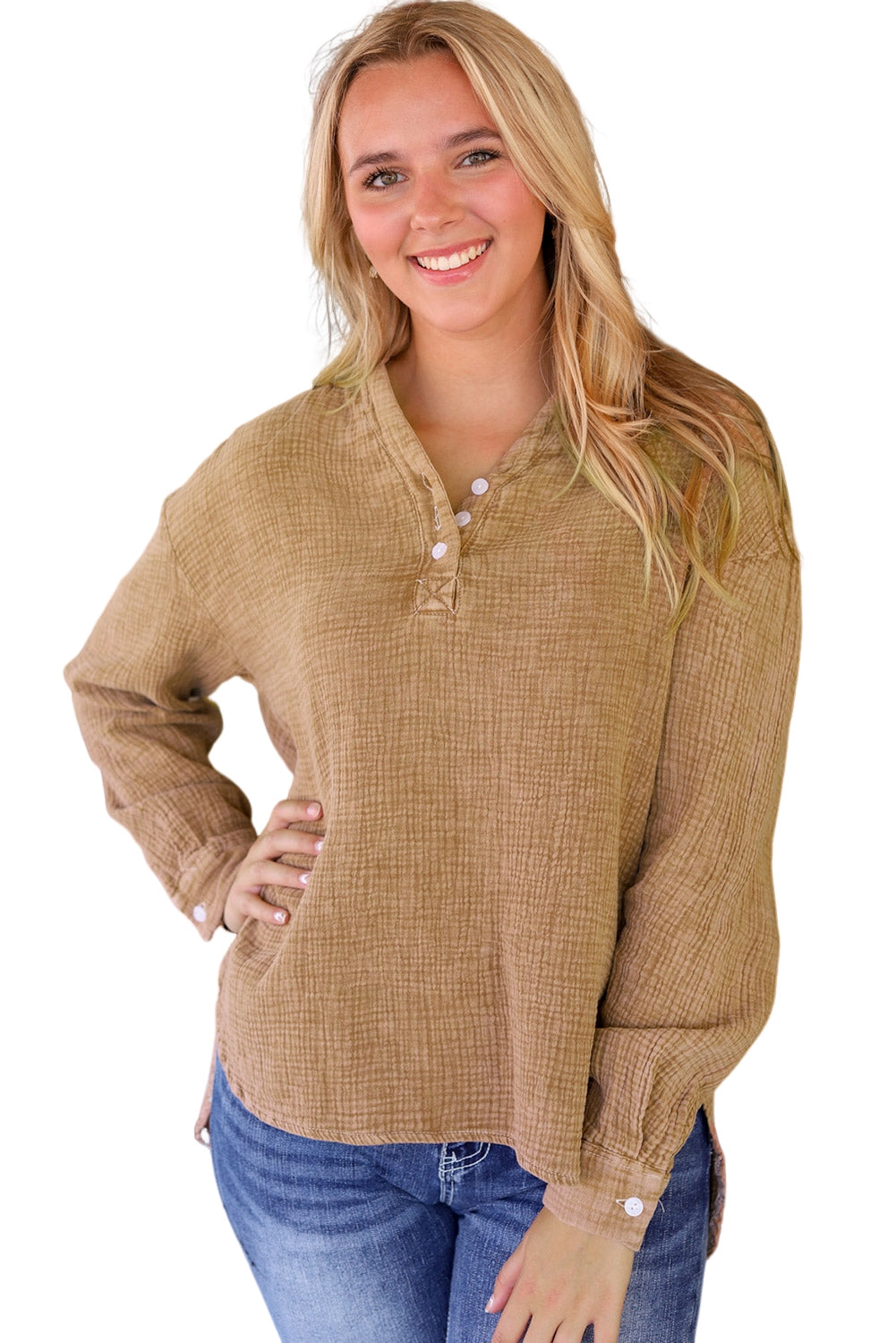 - This Plus Size Split Neck Buttons Crinkled Blouse is stylish and casual