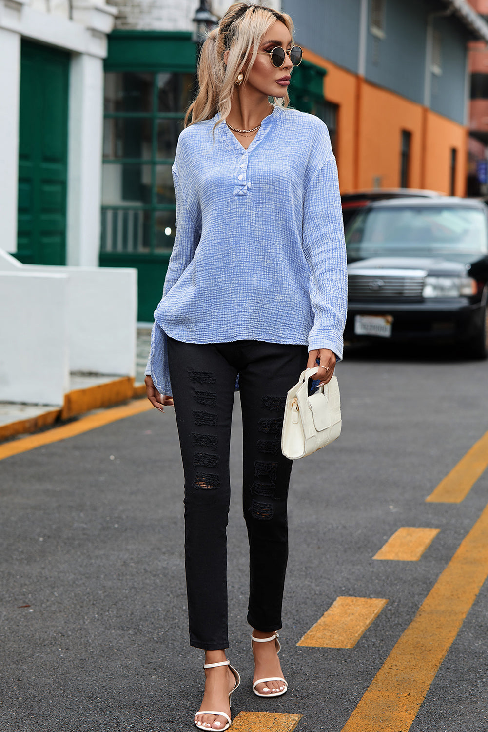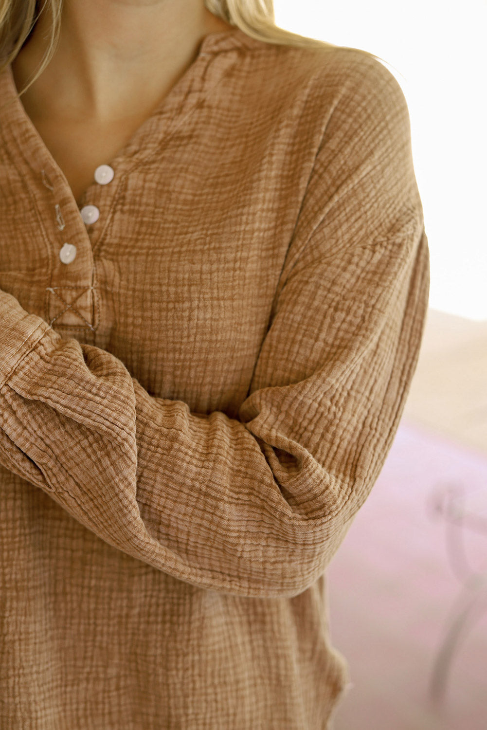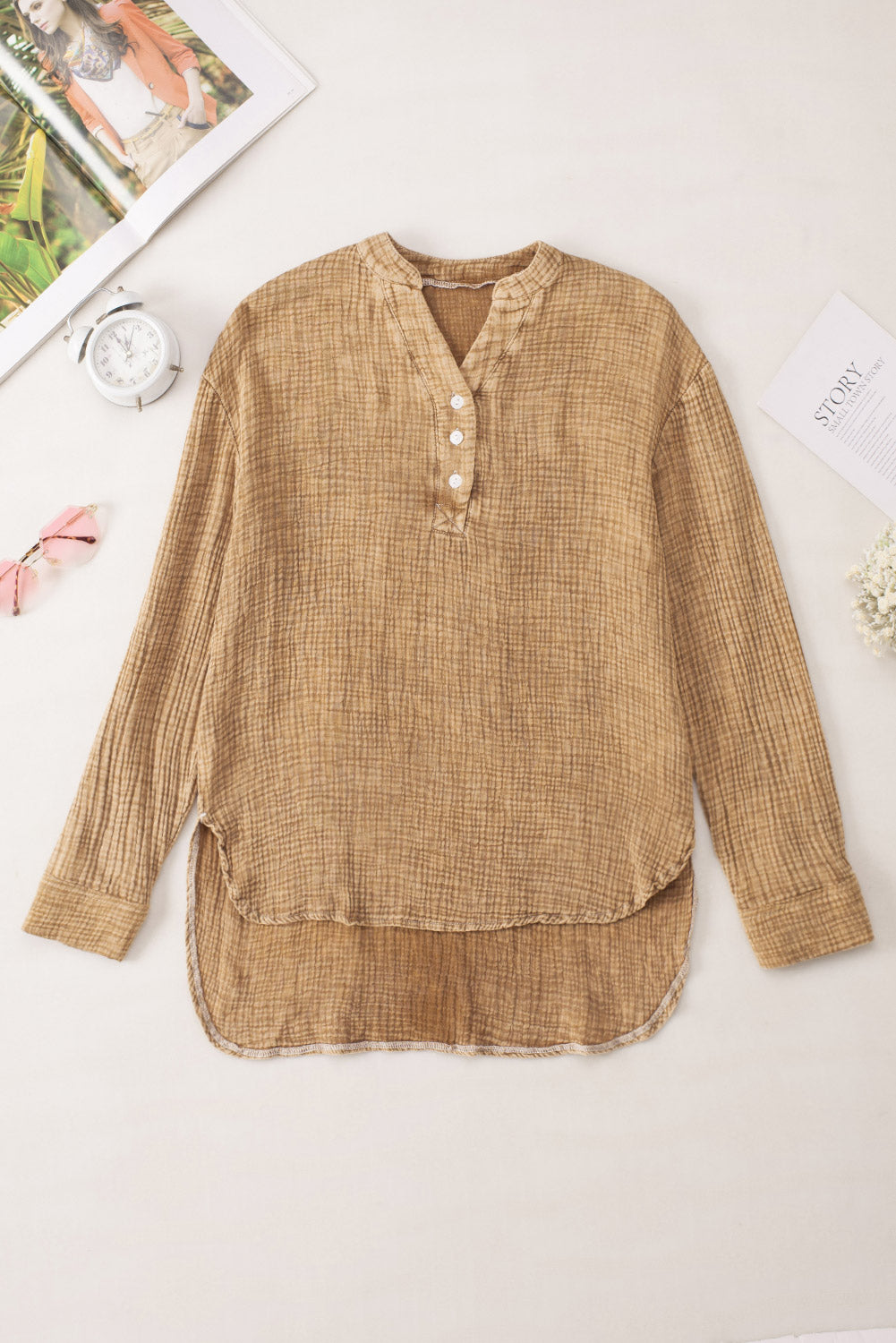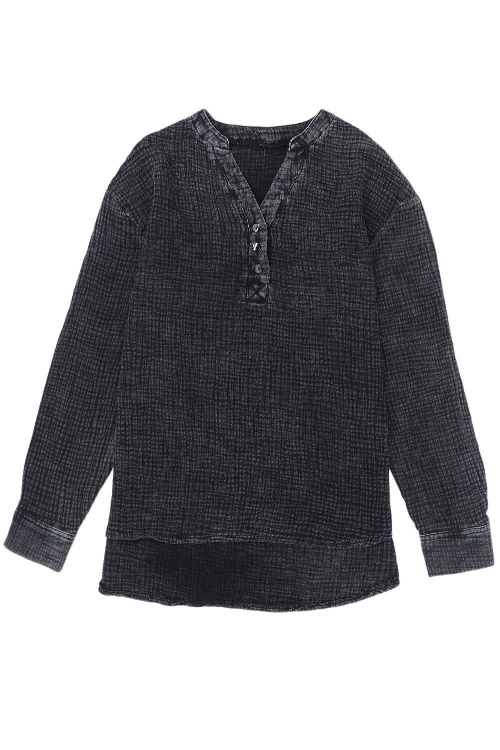 - This Plus Size Split Neck Buttons Crinkled Blouse is stylish and casual