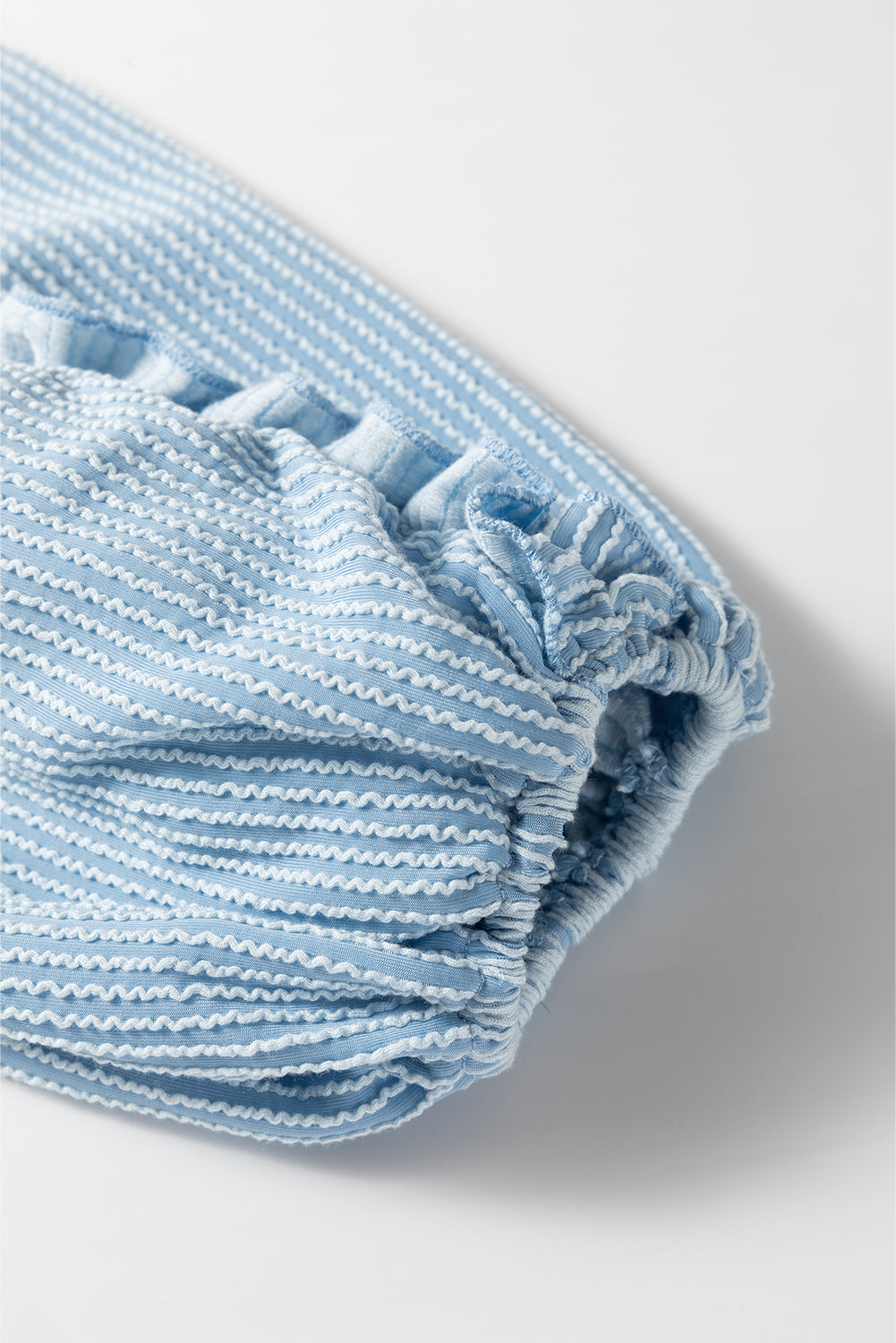 Mist Blue Corded Frilly Puff Sleeve Round Neck Blouse