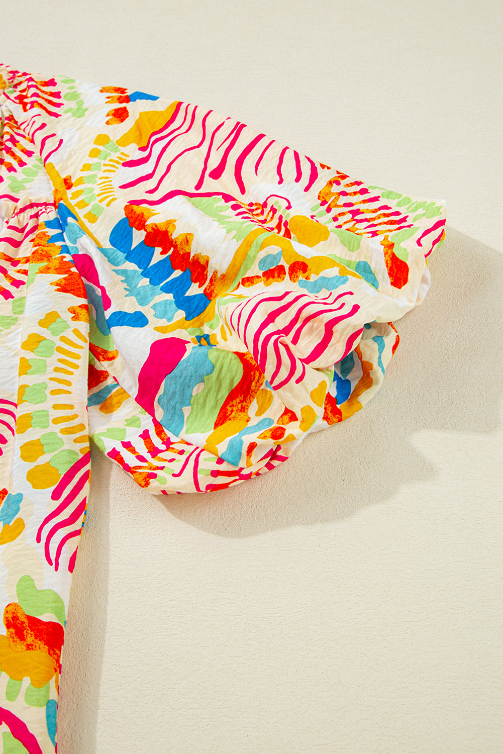 Orange Abstract Printed Shirred Bubble Half Sleeve V Neck Blouse
