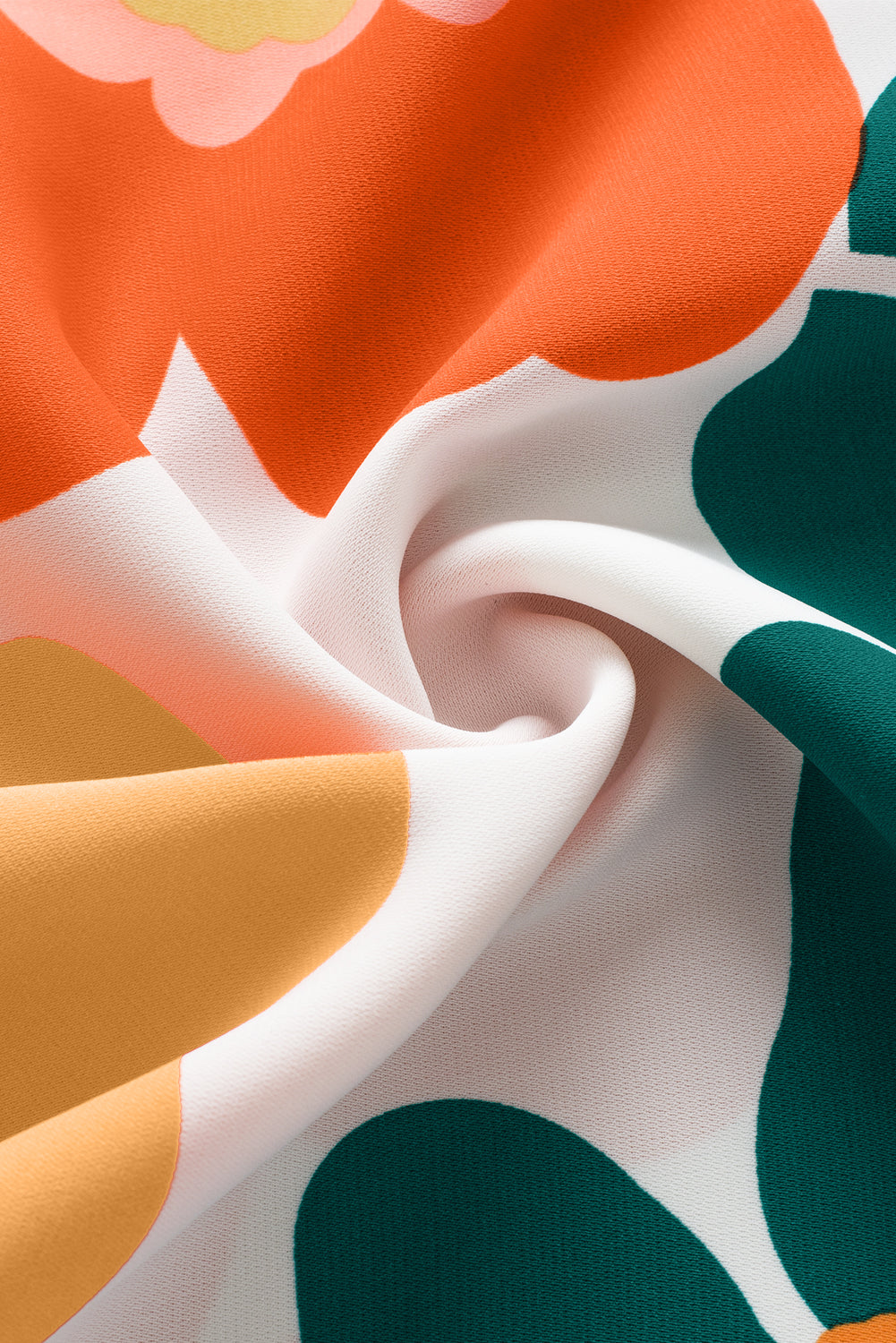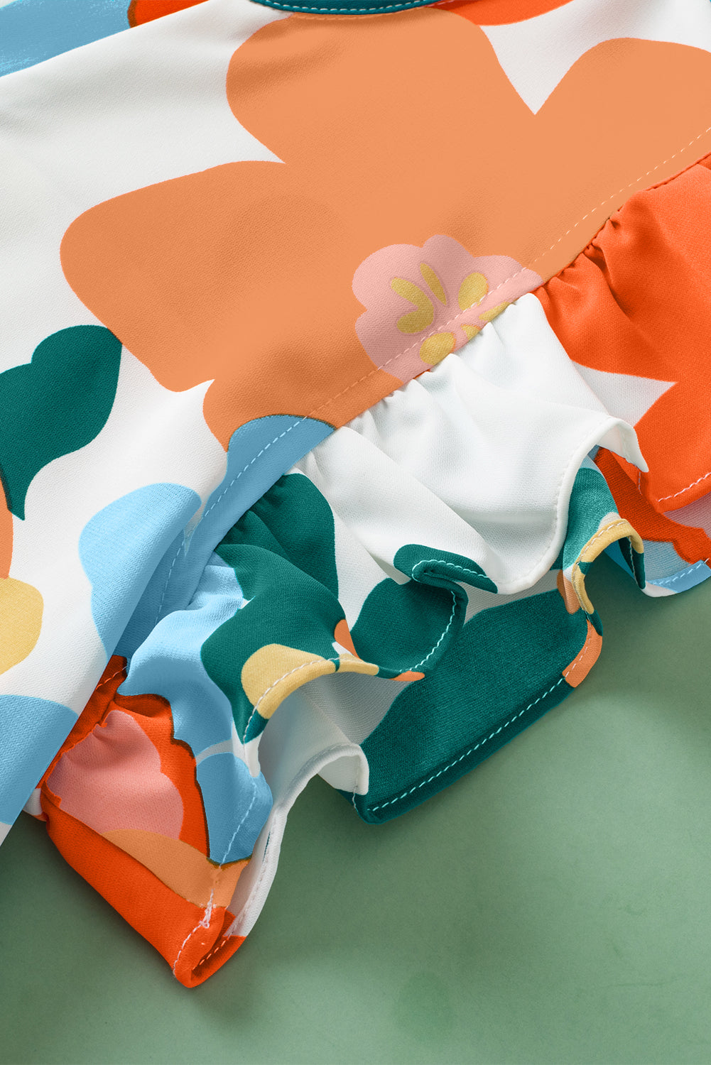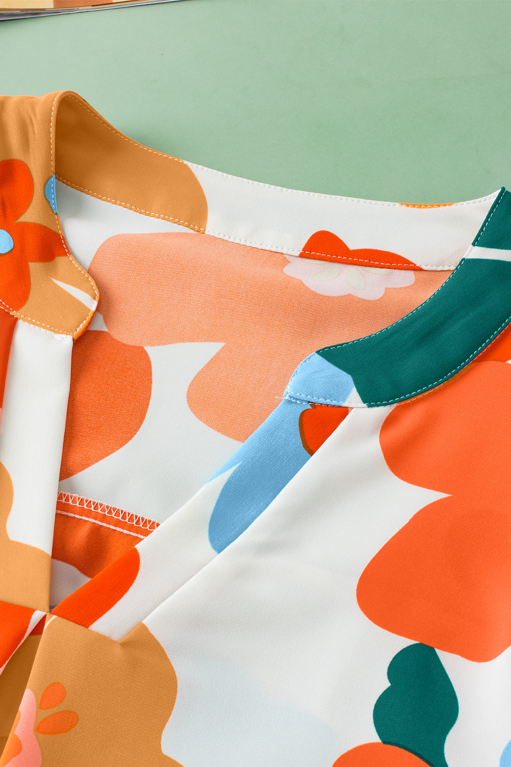 Orange Floral Notched V Neck Ruffled Sleeve Blouse