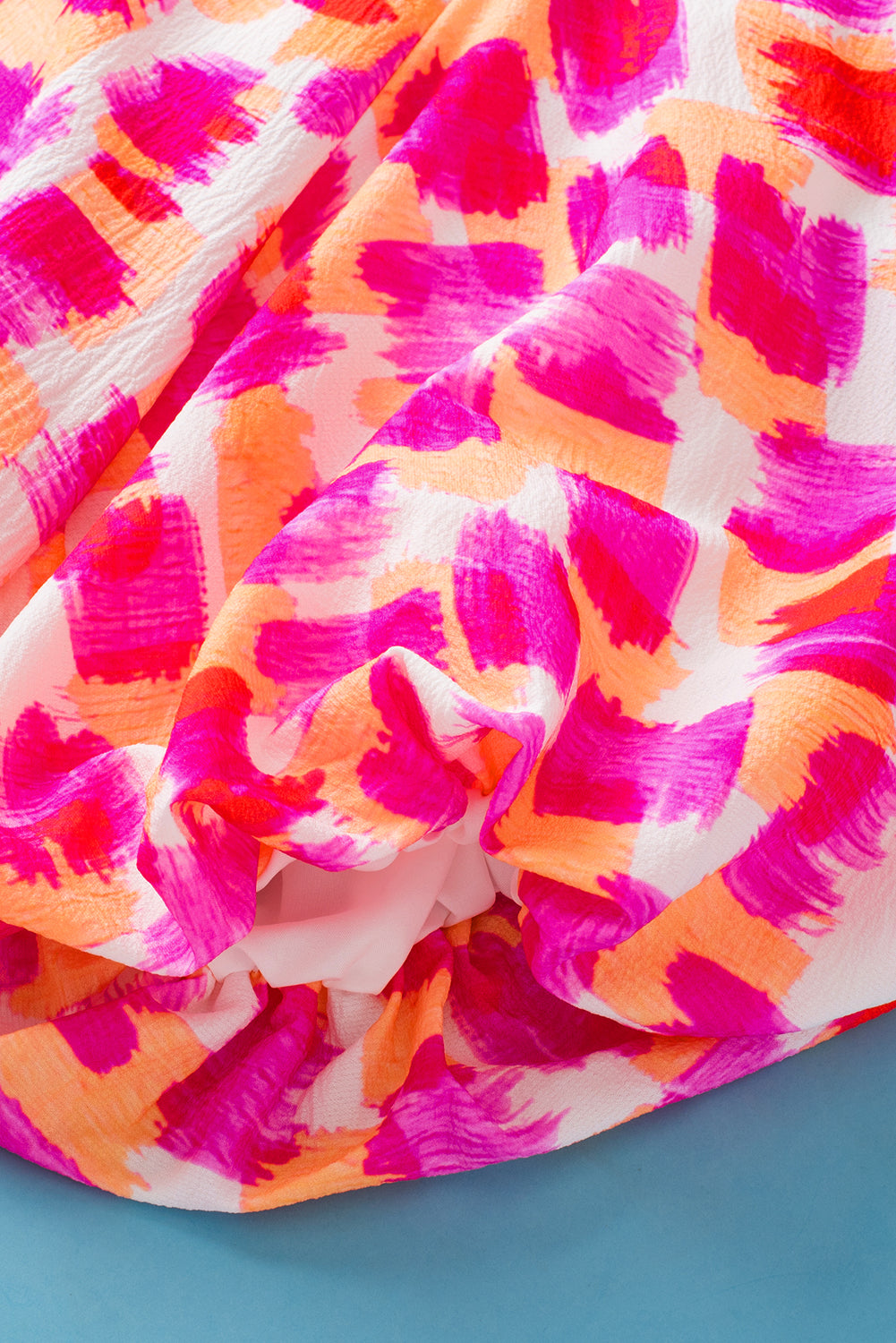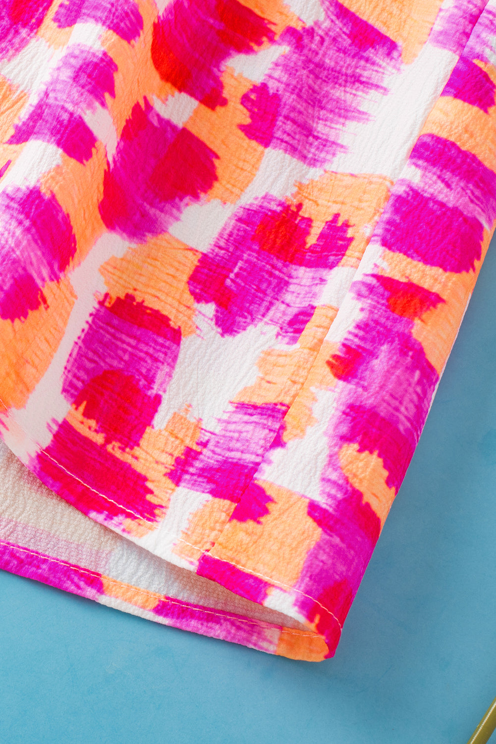 Pink Abstract Print Button Back Ruffed High Neck Blouse