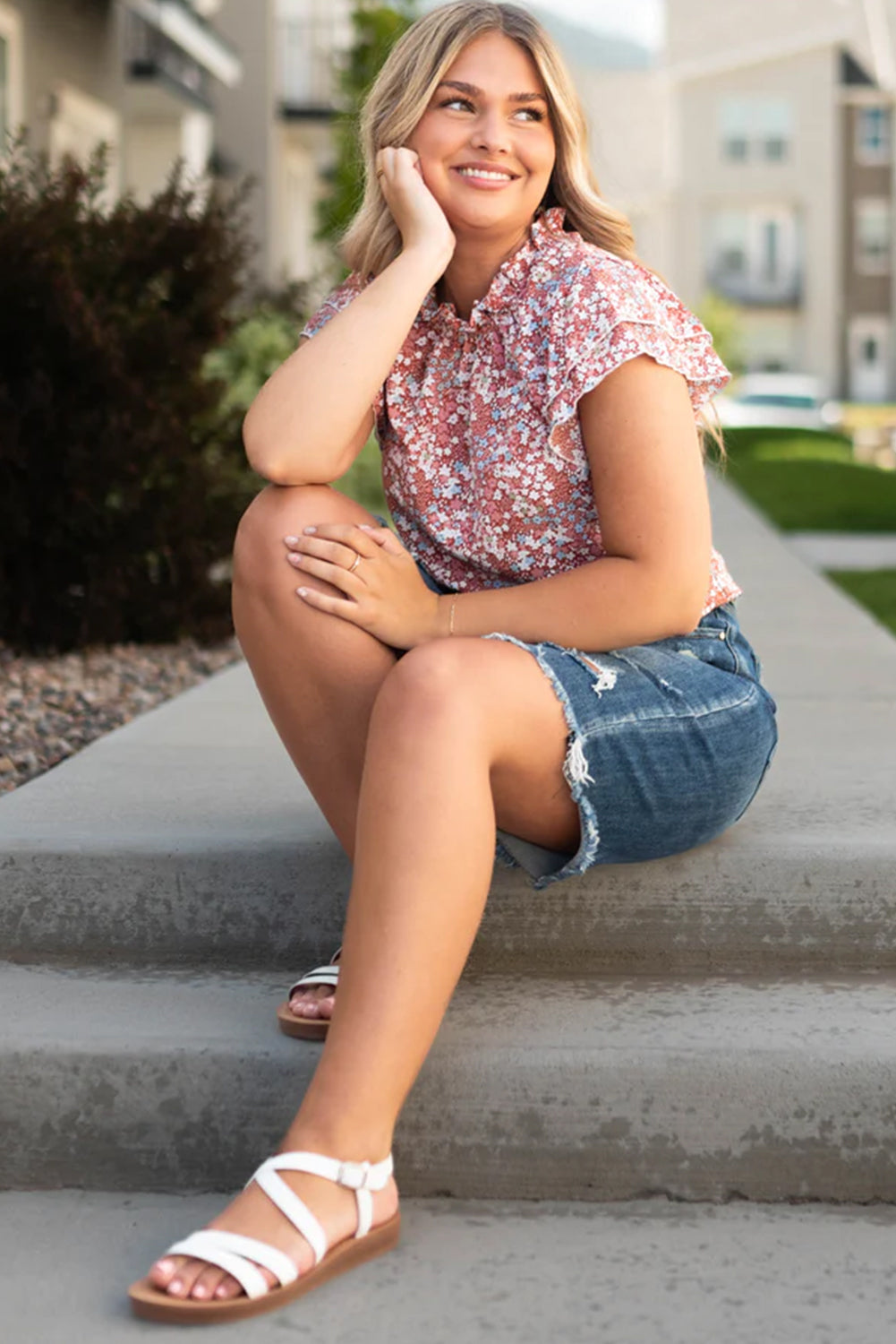 Pink Plus Size Floral Print Ruffled Sleeve Frilled Neck Blouse