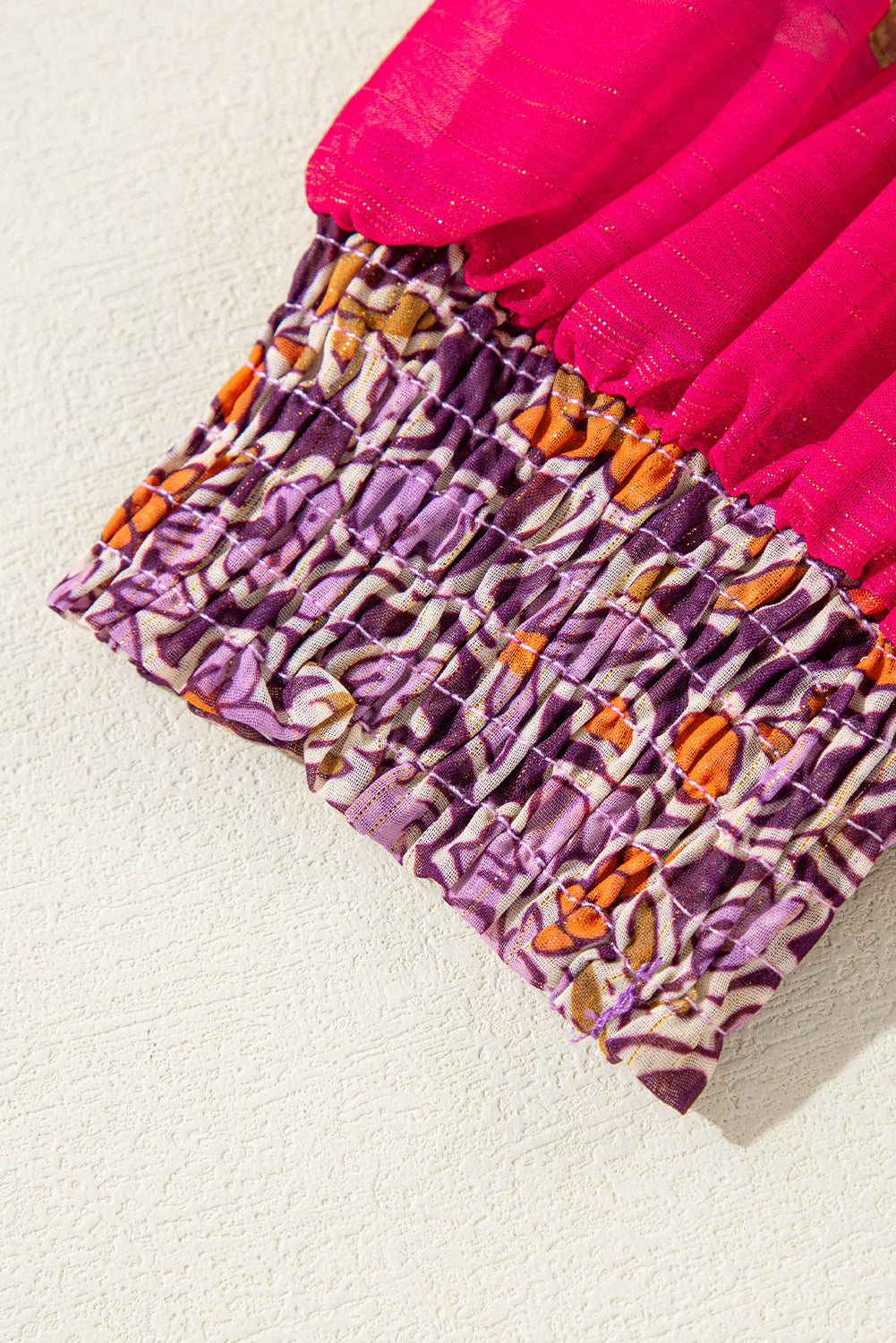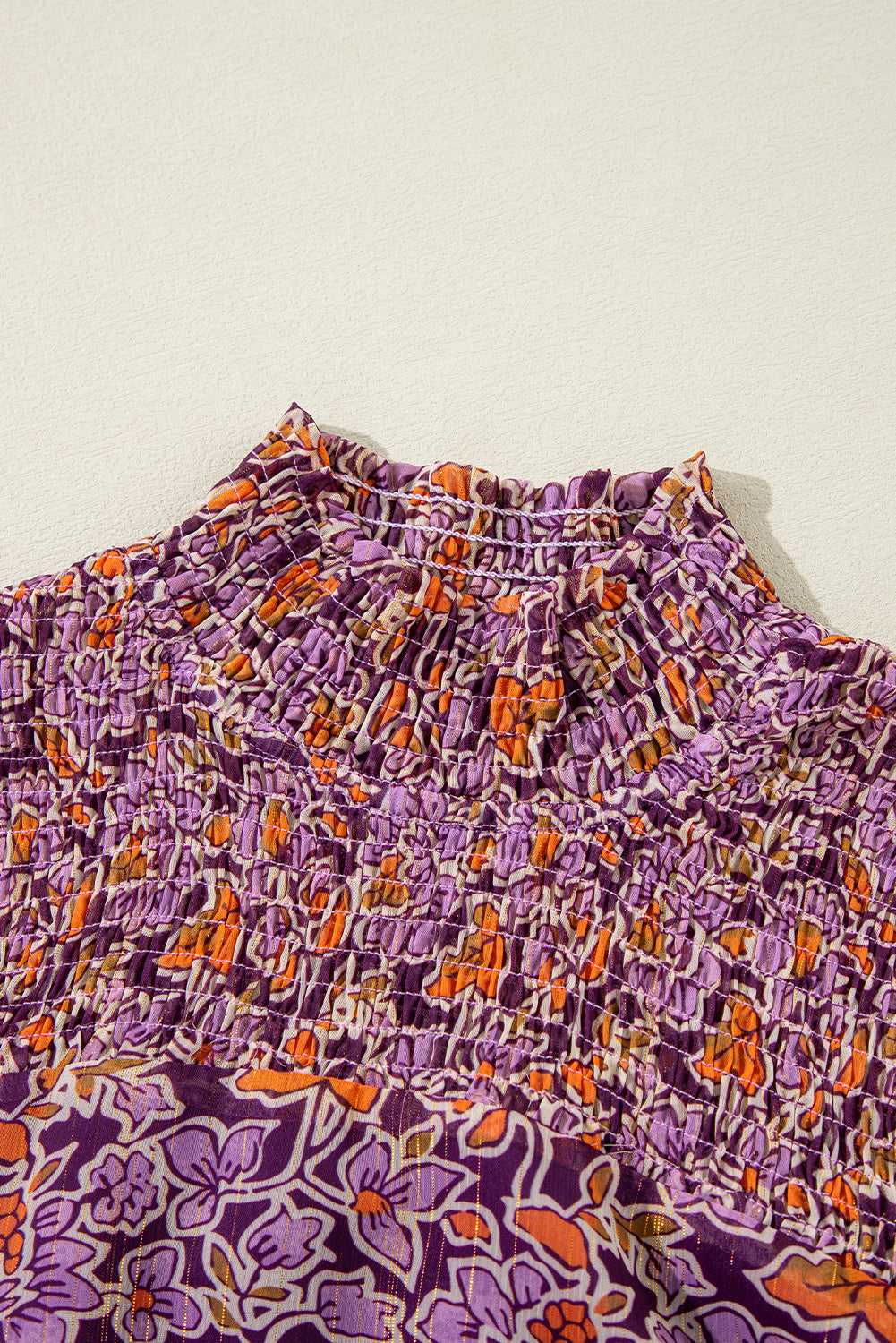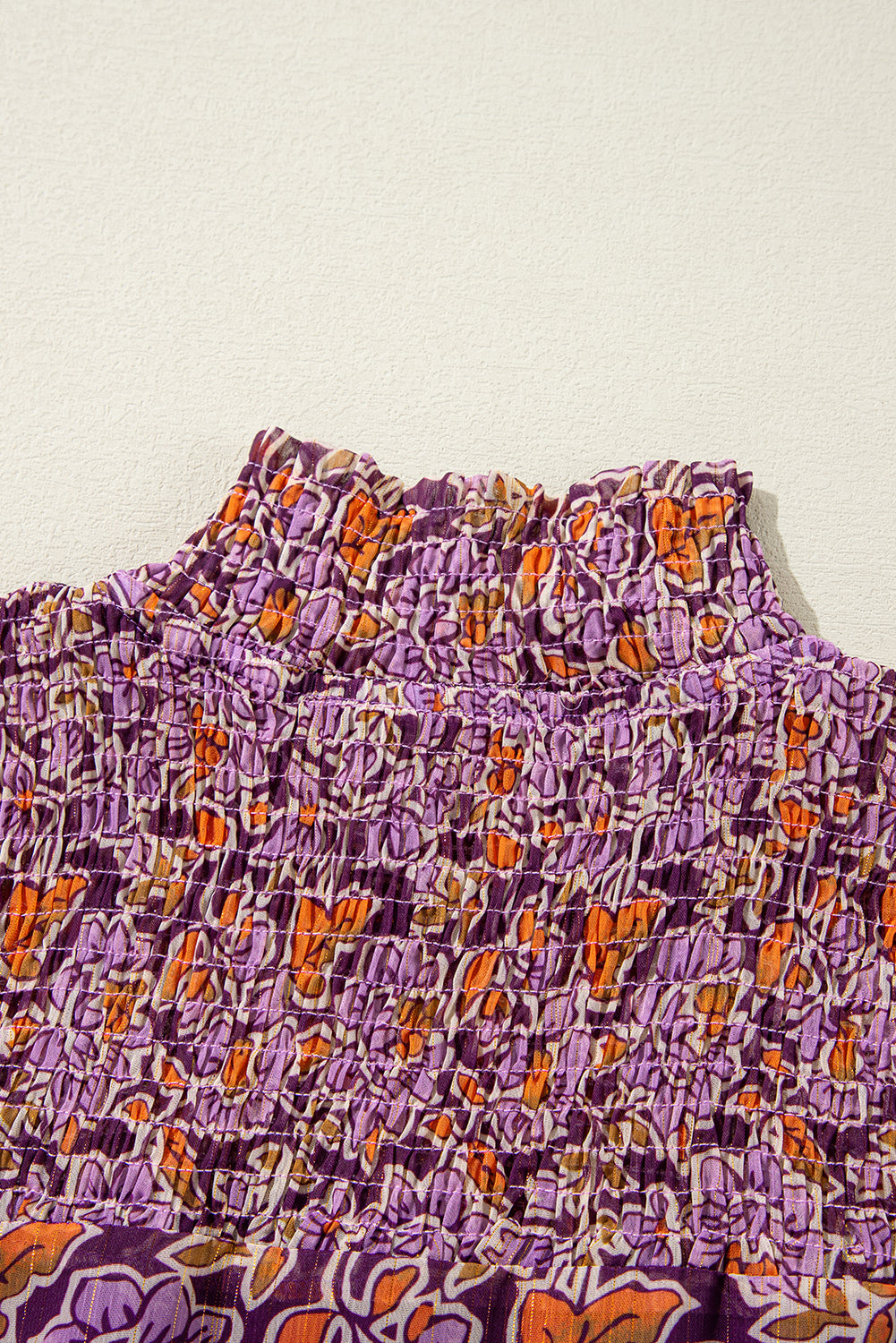 Purple Floral Smocked Puff Sleeve High Neck Mini Dress