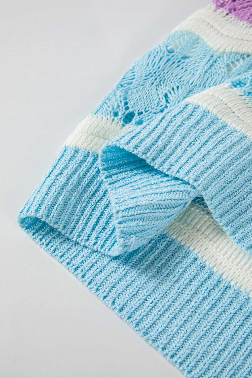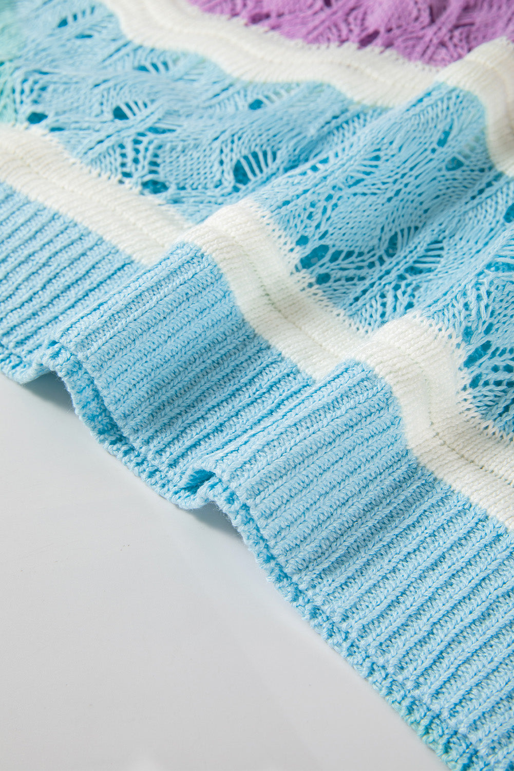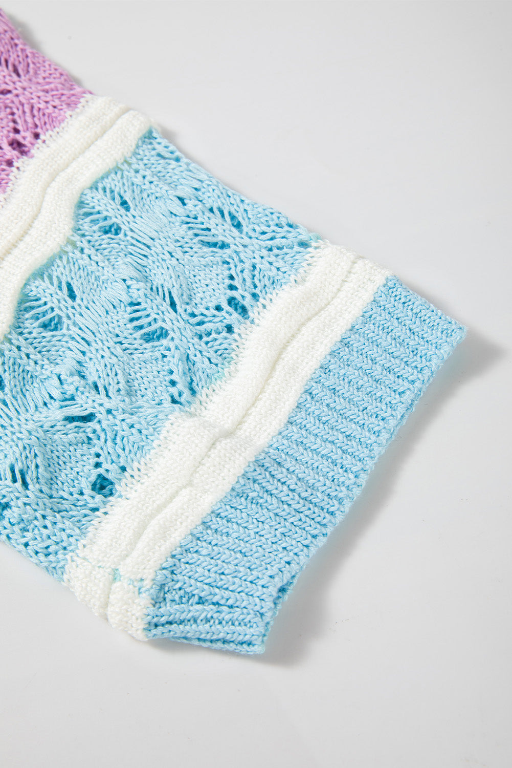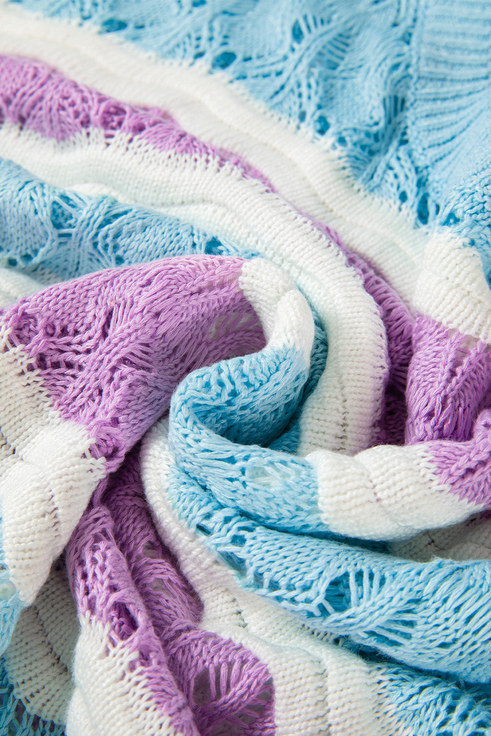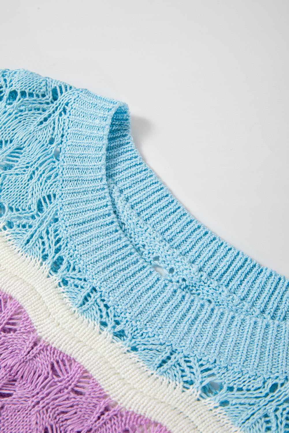 Purple Stripe Color Block Hollow Out Crochet Half Sleeve Sweater