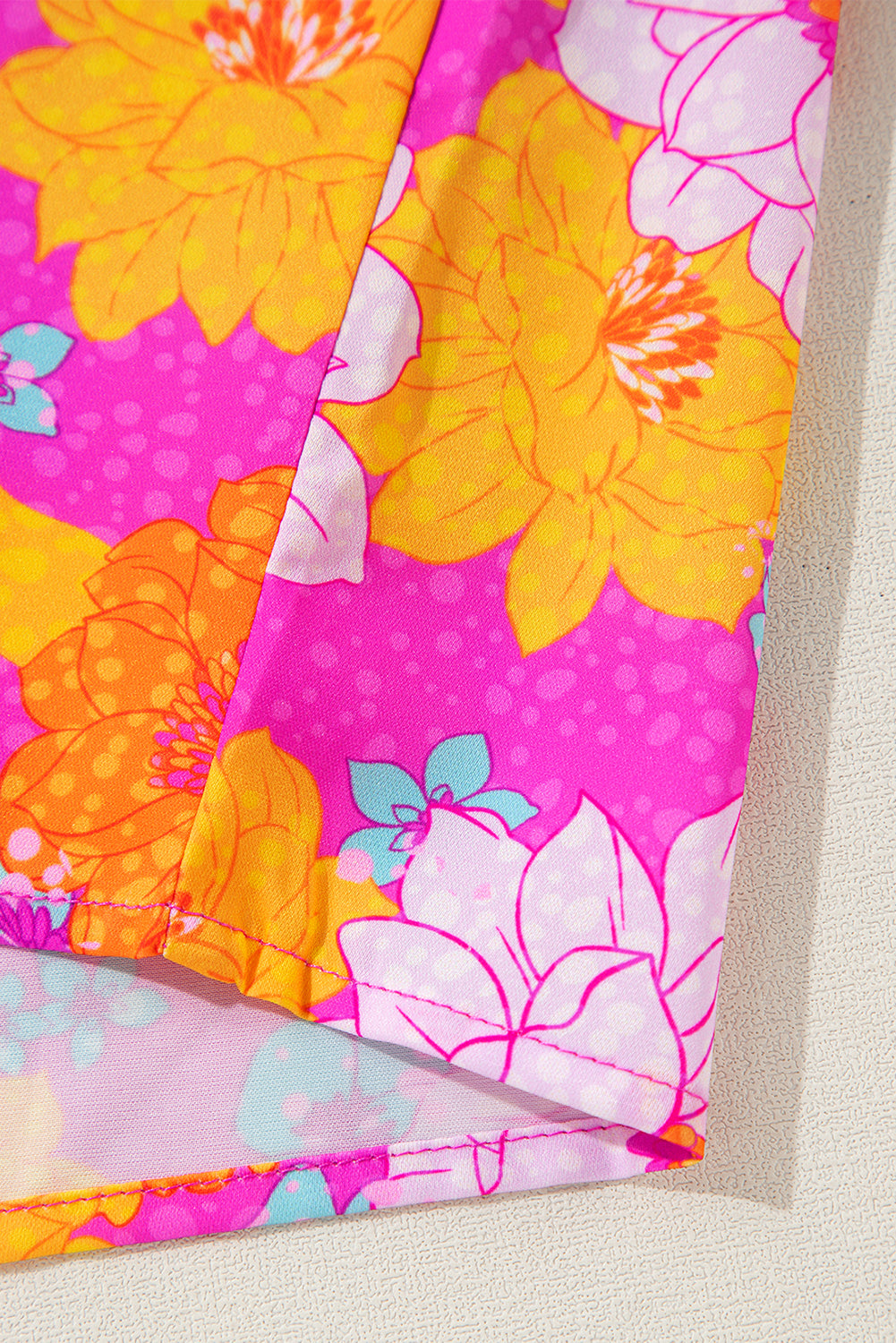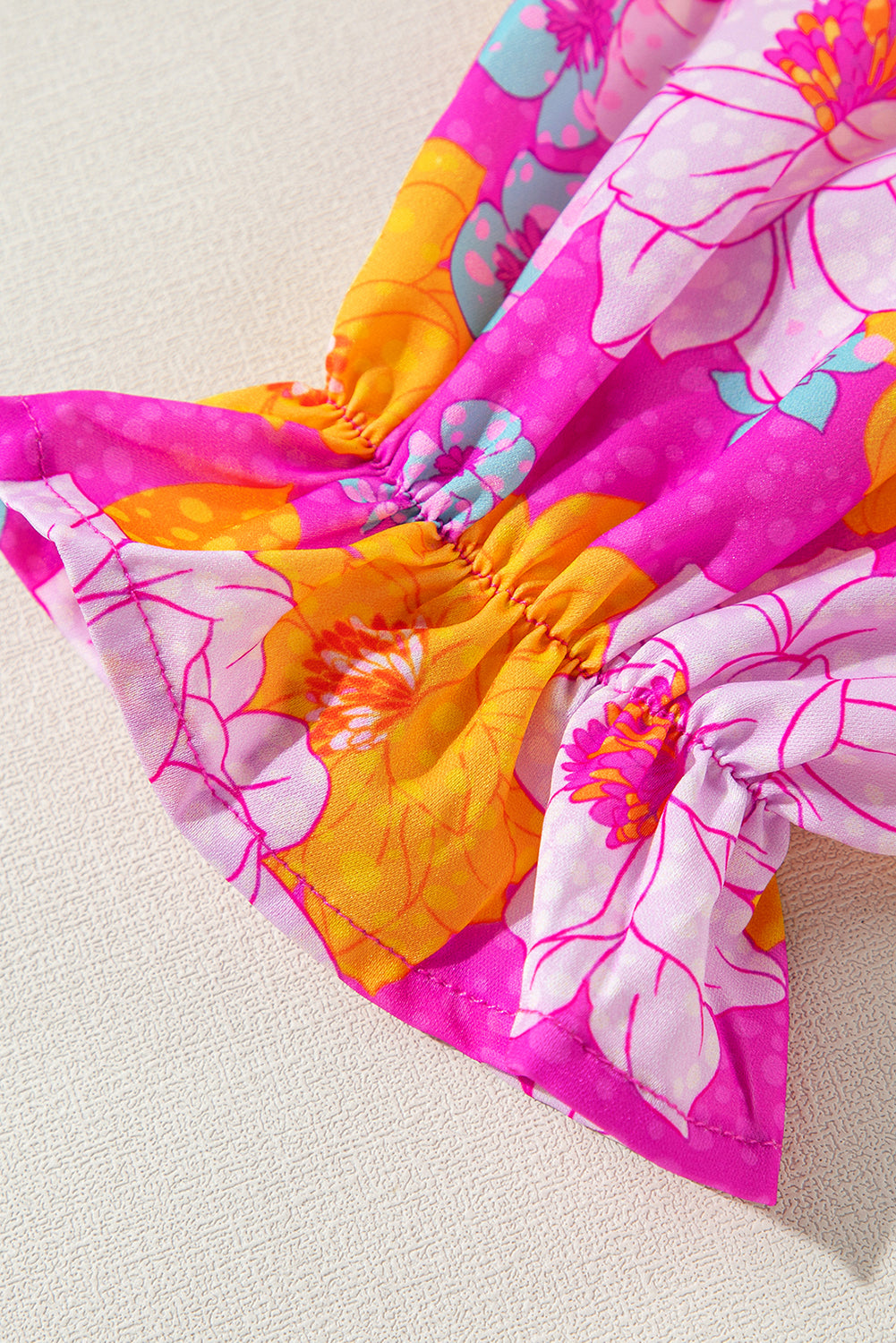 Rose Floral Print Flounce Sleeve Notched Neck Blouse