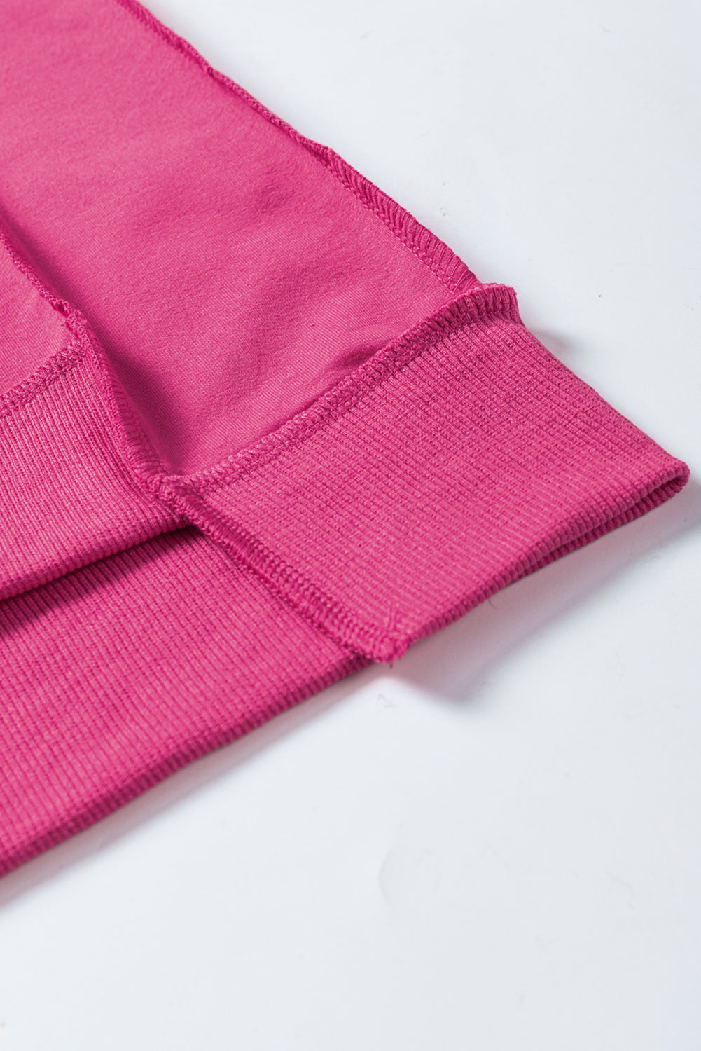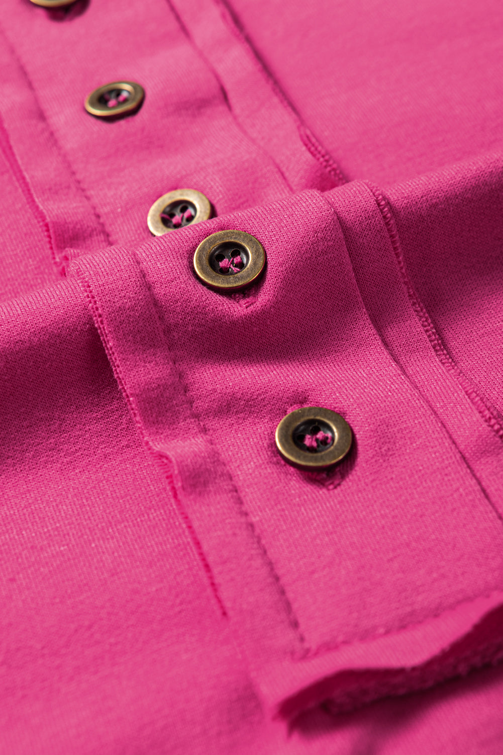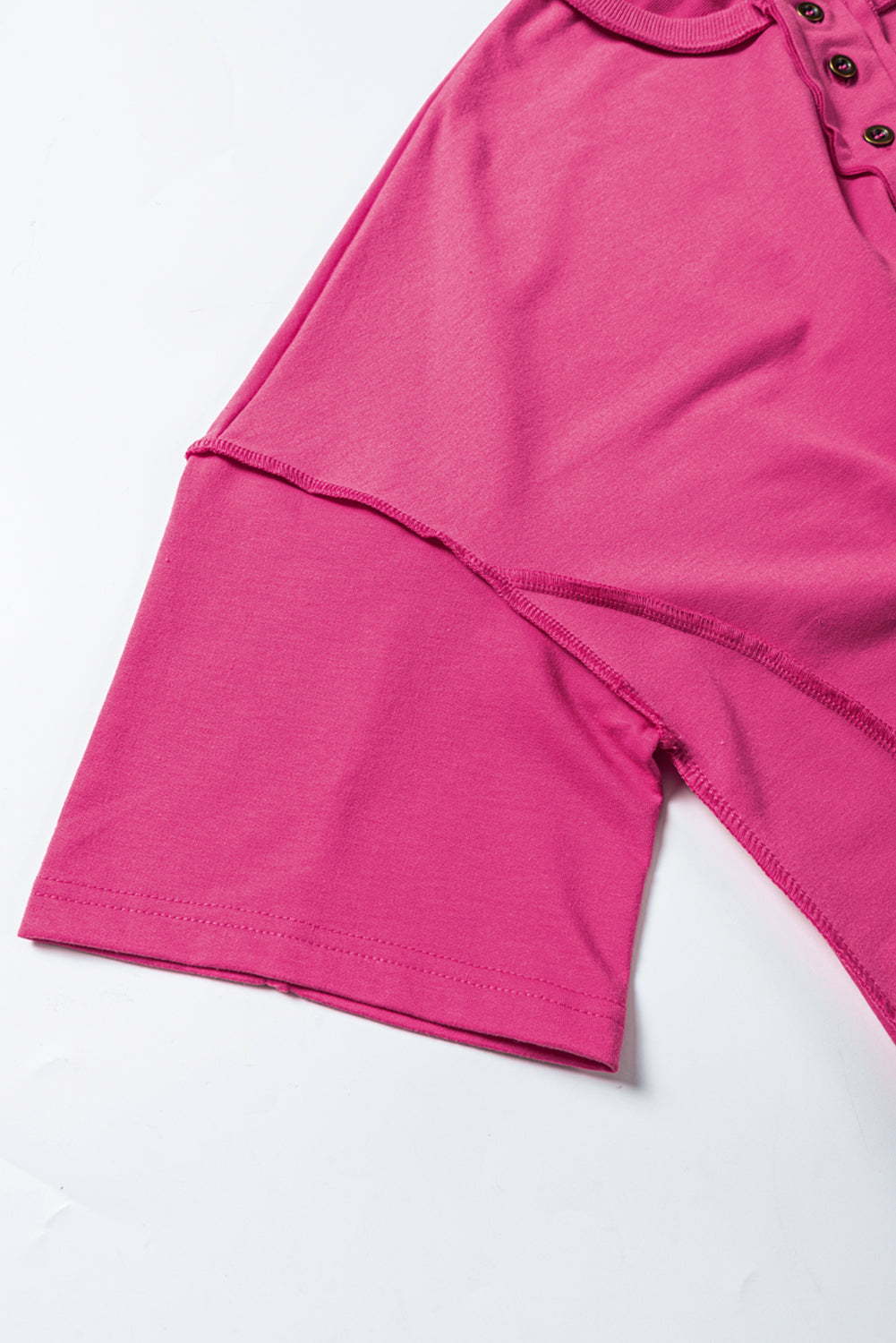 Rose Red Exposed Seam Button Neck Wide Sleeve Tunic Top