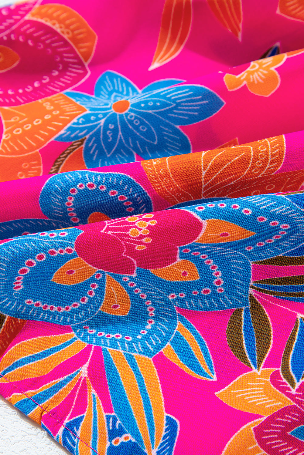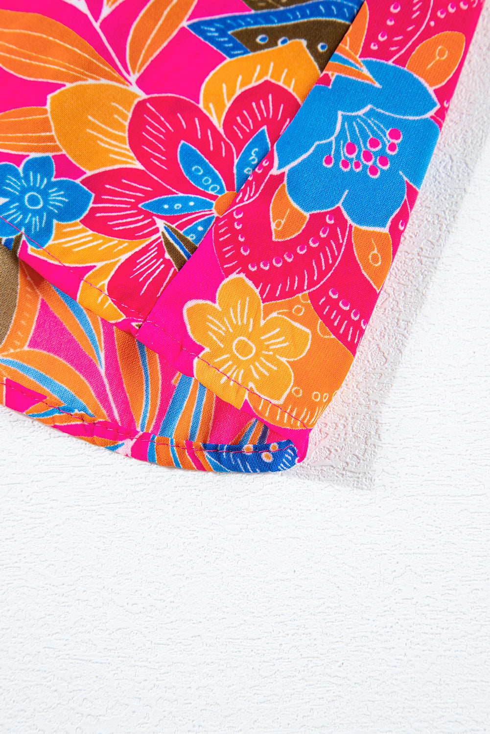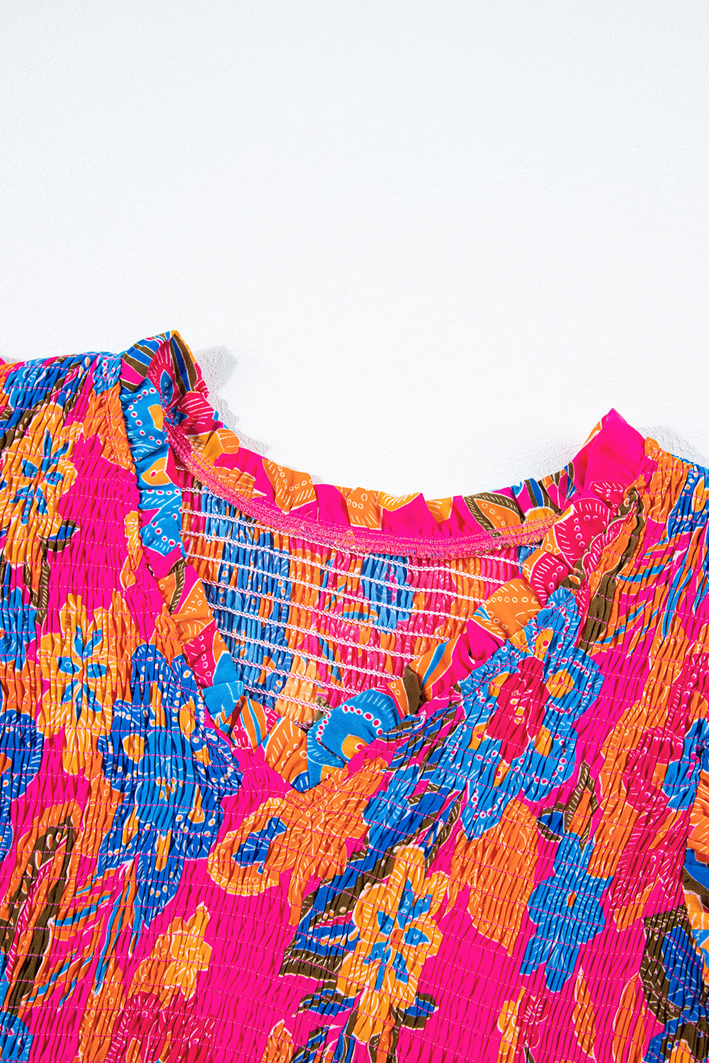 Rose Red Floral Print Smocked Ruffle Trim Flutter Sleeve Blouse