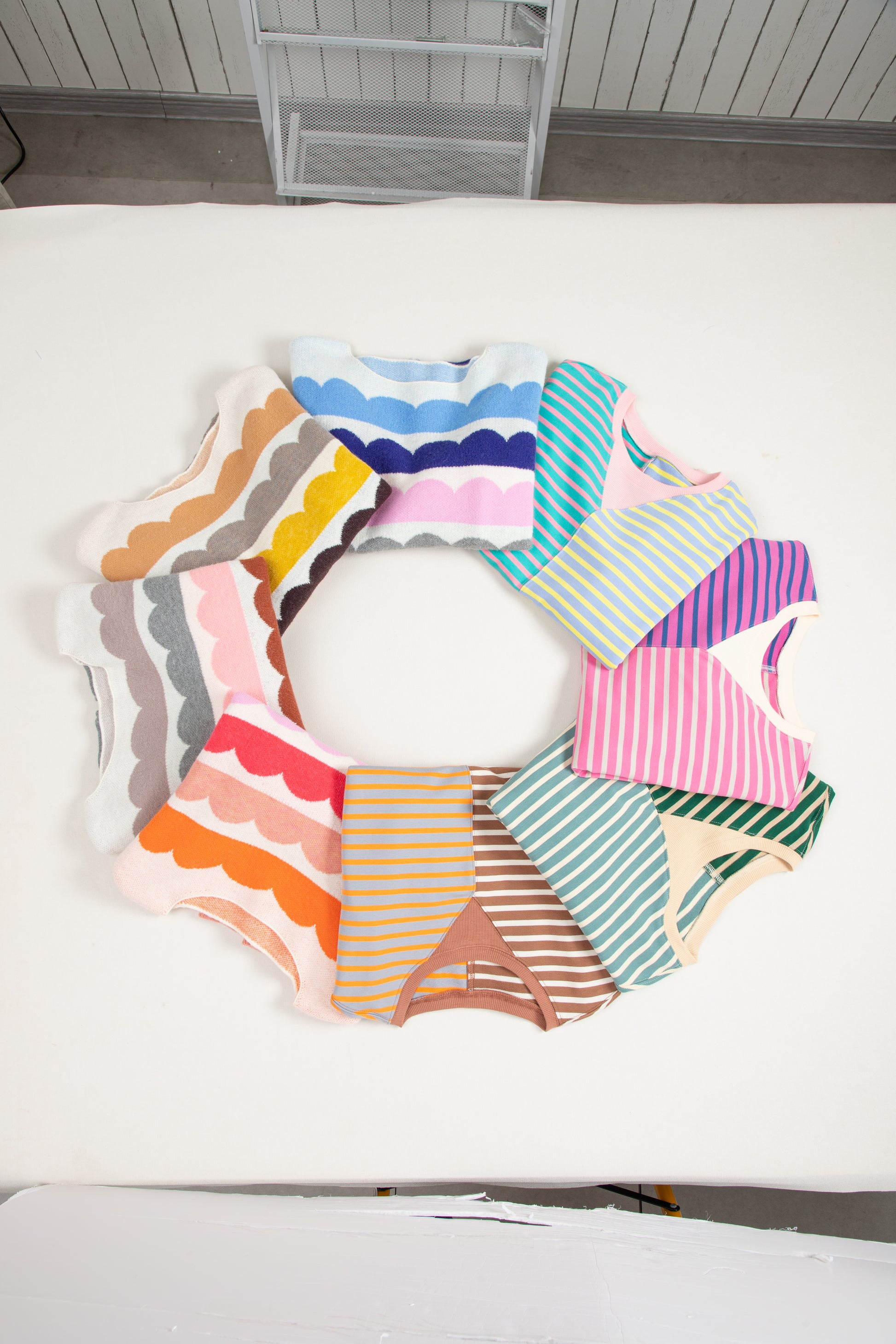 Rose Red Wave Striped Balloon Sleeve Drop Shoulder Sweater