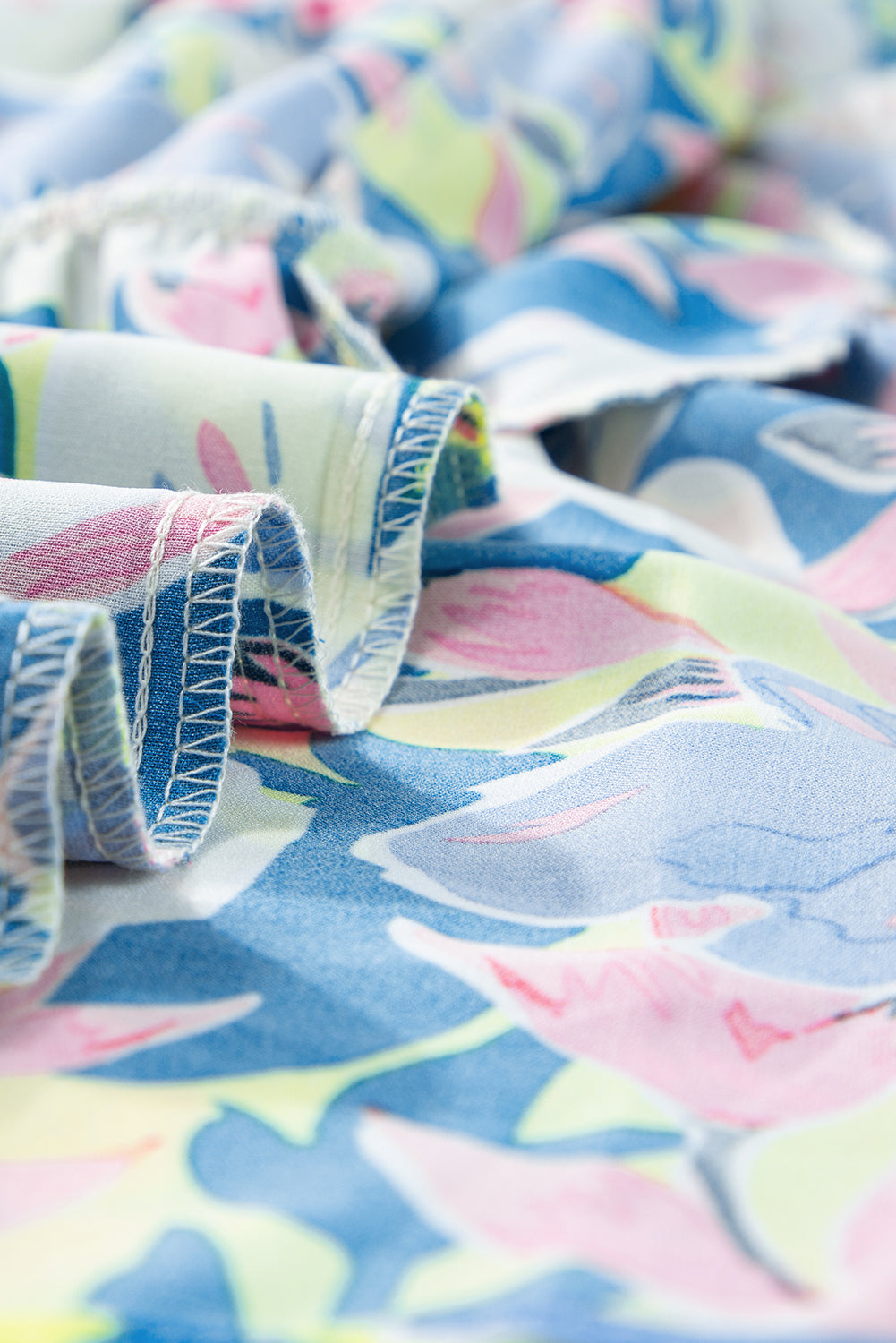 Sky Blue Floral Printed V Notched Ric Rac Flutter Sleeve Dress