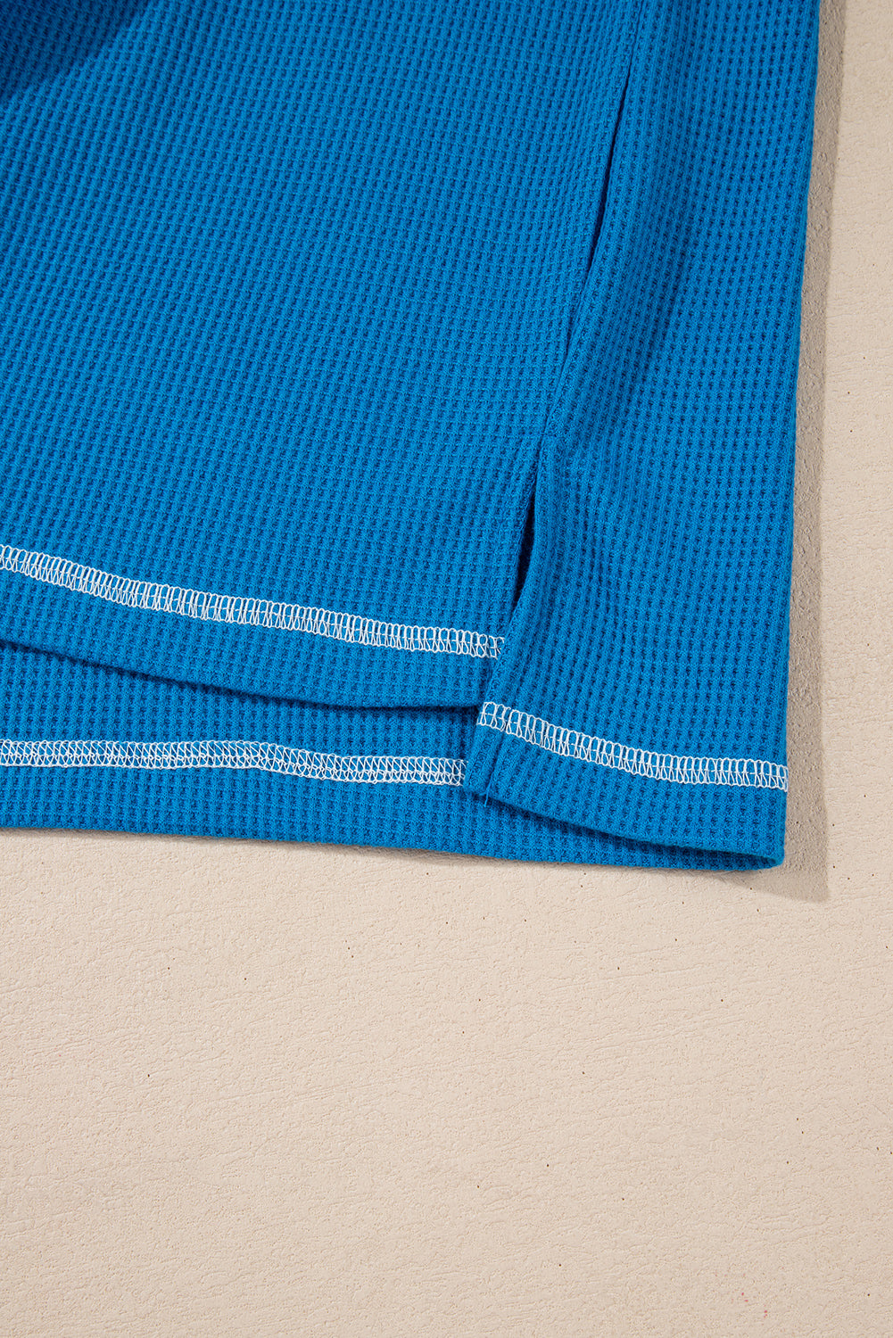 Sky Blue Lace Floral Patchwork Sleeve Stitching V Neck Rib Knit Blouse