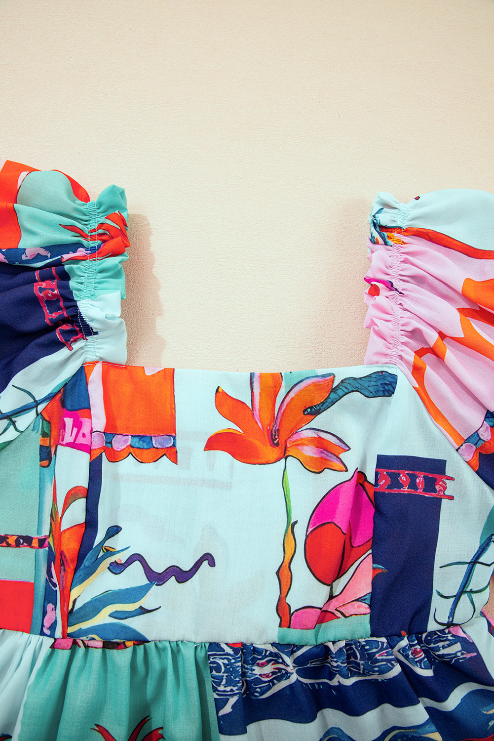 Sky Blue Tropical Printed Square Neck Flutter Sleeve Babydoll Blouse