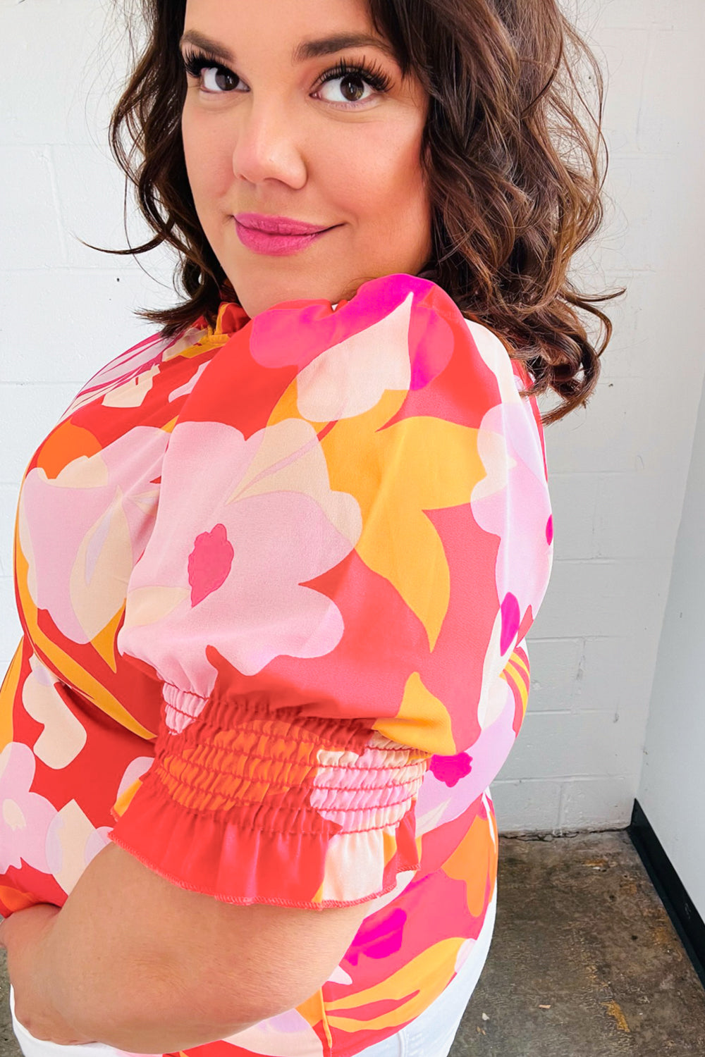 Smocked Bubble Frill Sleeves + Back Neck Button Enclosure + Flat Floral Print