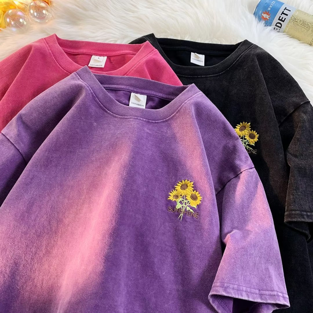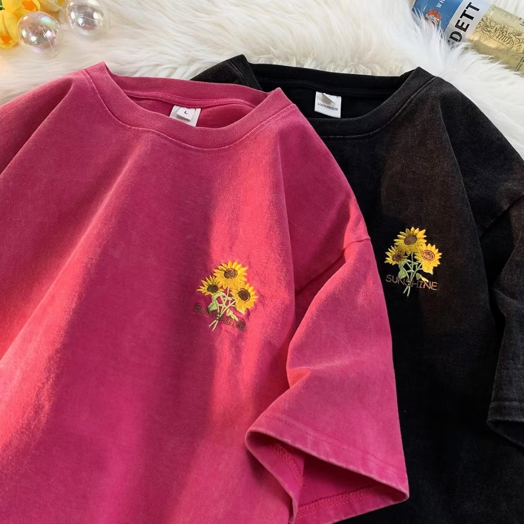 Sunflower Embroidered Washed Short-sleeved T-shirt For Men