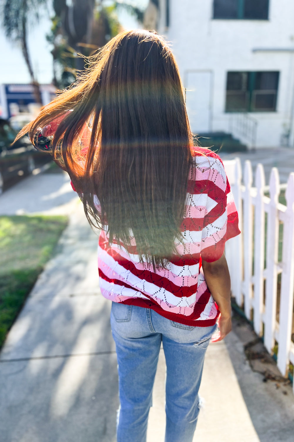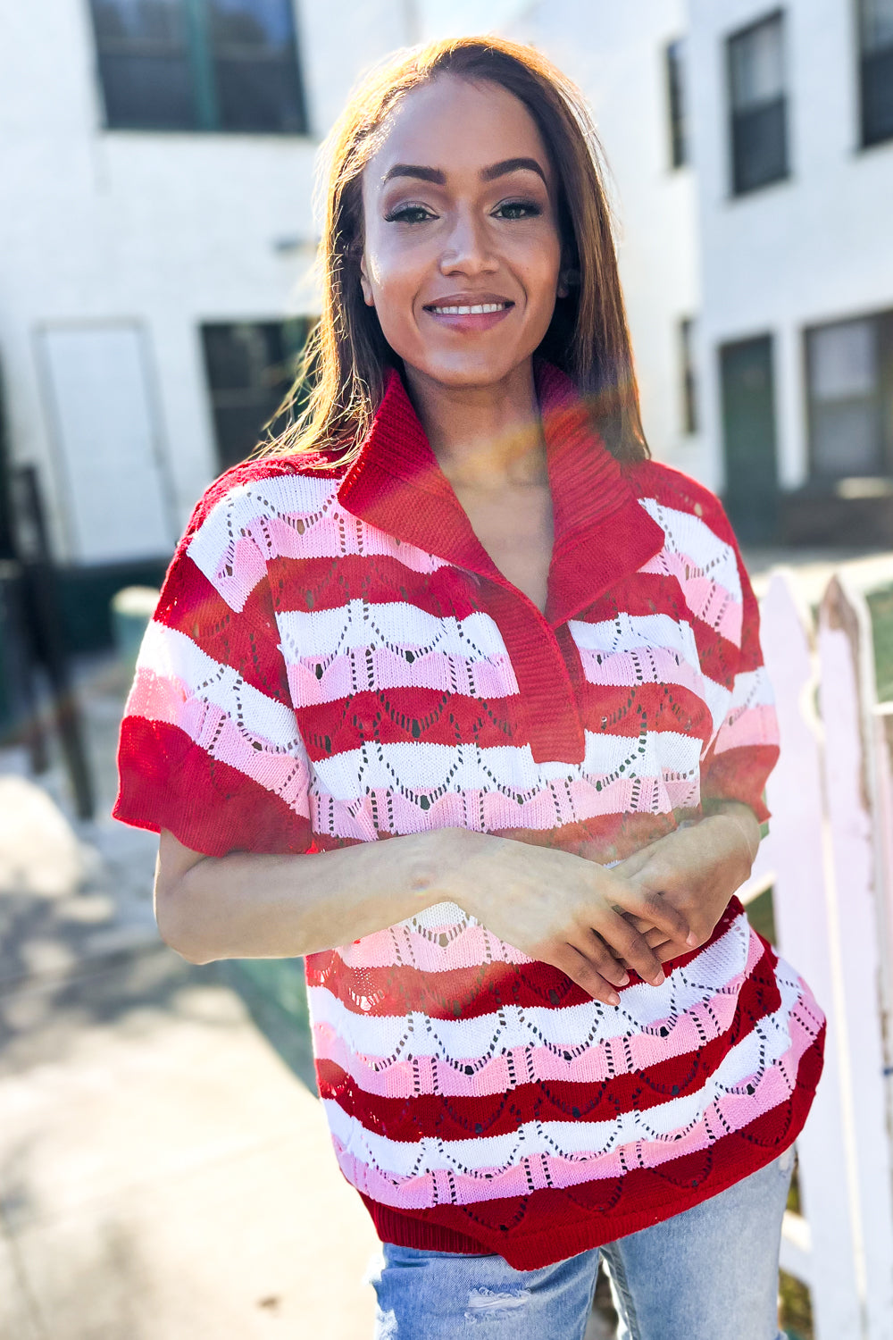 This soft loose knit sweater has a stunning heart print and a feminine Pointelle design. With an elevated notched collar neck and ribbed short sleeves, be prepared to look adorable for your Valentine!